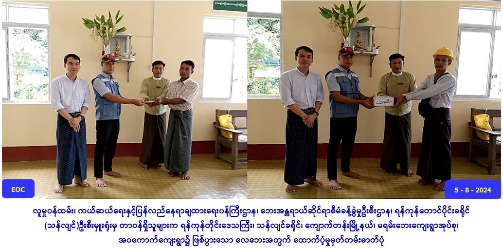 လူမှု၀န်ထမ်း၊ ကယ်ဆယ်ရေးနှင့်ပြန်လည်နေရာချထားရေး၀န်ကြီးဌာန၊ ဘေးအန္တရာယ်ဆိုင်ရာစီမံခန့်ခွဲမှုဦးစီးဌာန၊ ရန်ကုန်တောင်ပိုင်းခရိုင် (သန်လျင်) ဦးစီးမှူးရုံးမှ တာဝန်ရှိသူများသည် (၃၁-၇-၂၀၂၄) ရက်နေ့၊ (၀၈:၀၀) နာရီအချိန်၌ သန်လျင်ခရိုင်၊ ကျောက်တန်းမြို့နယ်၊ မရမ်းဘေးကျေးရွာအုပ်စု၊ အဝကောက်ကျေးရွာတွင် လေဆင်နှာမောင်းတိုက်ခတ်မှုကြောင့် လေဘေးသင့်အိမ်ခြေ (၄)လုံး (တစ်စိတ်တစ်ပိုင်းပျက်စီး)၊ အိမ်ထောင်စု (၄)စု၊ လူဦးရေ (၁၄)ဦးတို့ လေဘေးသင့်ခဲ့ပါသဖြင့် အဆိုပါ ဘေးသင့်ပြည်သူများအတွက် လူဦးရေ (၁၄)ဦးအတွက် ဆန်ရိက္ခာဖိုး (၂၉၄၀ဝိ/-)၊ တစ်စိတ်တစ်ပိုင်းပျက်စီးအိမ်ခြေ (၄)လုံး အတွက် အိမ်ဆောက်ပစ္စည်းဖိုး (၂၀၀၀၀ဝိ/-)၊ စုစုပေါင်းထောက်ပံ့ငွေ (၂၂၉၄၀ဝိ/-)တို့အား (၅-၈-၂၀၂၄) ရက်နေ့၊ (၁၂:၀၀)နာရီ အချိန်တွင် ဘေးသင့်ပြည်သူများ၏ လက်၀ယ်အရောက် သွားရောက်ထောက်ပံ့ပေးအပ်ခဲ့ပါကြောင်း သတင်းရရှိပါသည်။