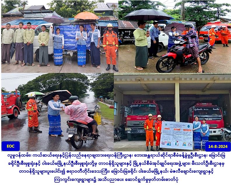 လူမှု၀န်ထမ်း၊ ကယ်ဆယ်ရေးနှင့်ပြန်လည်နေရာချထားရေး၀န်ကြီးဌာန၊ ဘေးအန္တရာယ်ဆိုင်ရာစီမံခန့်ခွဲမှုဦးစီးဌာန၊ မြောင်းမြခရိုင်ဦးစီးမှူးရုံးနှင့် ဝါးခယ်မမြို့နယ်ဦးစီးမှူးရုံတို့မှ တာဝန်ရှိသူများနှင့် မြို့နယ်စီမံအုပ်ချုပ်ရေးအဖွဲ့များ၊ မီးသတ်ဦးစီးဌာနမှ တာဝန်ရှိသူ များပူးပေါင်း၍ (၁၄-၈-၂၀၂၄) ရက်နေ့တွင် ဝါးခယ်မ မြို့နယ်၊ မဲဇလီချောင်းကျေးရွာနှင့် ကြာကွင်းကျေးရွာများ၌ မိုးကြိုကာလအတွင်း ဖြစ်ပွားလေ့ရှိသော ရေဘေးနှင့် မြေပြိုဘေးအန္တရာယ်ဆိုင်ရာ ဆောင်ရန် / ရှောင်ရန်အချက်များအား ရပ်ကွက်၊ ကျေးရွာနေပြည်သူများသိရှိစေရန် လိုက်လံနှိုးဆော်အသိပညာပေးခြင်း၊ ဗီနိုင်းပိုစတာနှင့် လက်ကမ်းစာစောင်ဖြန့်ဝေပေးခြင်းများ ဆောင်ရွက်ခဲ့ပါကြောင်း သတင်းရရှိပါသည်။