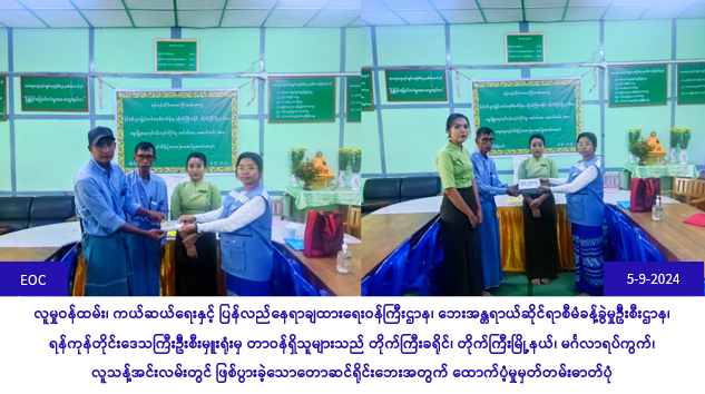 လူမှု၀န်ထမ်း၊ ကယ်ဆယ်ရေးနှင့် ပြန်လည်နေရာချထားရေး၀န်ကြီးဌာန၊ ဘေးအန္တရာယ်ဆိုင်ရာစီမံခန့်ခွဲမှုဦးစီးဌာန၊ ရန်ကုန်တိုင်းဒေသကြီးဦးစီးမှူးရုံးမှ တာ၀န်ရှိသူများသည် (၂၉-၈-၂၀၂၄) ရက်နေ့(၁၉:၀၀) နာရီအချိန်၌ ရန်ကုန်တိုင်းဒေသကြီး၊ တိုက်ကြီးခရိုင်၊ တိုက်ကြီးမြို့နယ်၊ မင်္ဂလာရပ်ကွက်၊ လူသန့်အင်းလမ်းတွင် တောဆင်ရိုင်း ၀င်ရောက်ဖျက်စီးမှုကြောင့် တစ်စိတ်တစ်ပိုင်းပျက်စီး အိမ်ခြေ (၇) လုံးအတွက် အိမ်ဆောက်ပစ္စည်းဖိုး ထောက်ပံ့ငွေ (၃၅၀,၀၀ဝိ/-)၊ အိမ်ထောင်စု (၇) စုရှိလူဦးရေ (၂၅) ဦးတို့အတွက် ဆန်ရိက္ခာဖိုးထောက်ပံ့ငွေ (၅၂,၅၀ဝိ/-)၊ စုစုပေါင်း ထောက်ပံ့ငွေ (၄၀၂,၅၀ဝိ/-) တို့အား (၅-၉-၂၀၂၄) ရက်နေ့ (၁၂:၅၁) အချိန်တွင် ပြည်သူများ၏ လက်၀ယ်အရောက် ထောက်ပံ့ပေးအပ်ခဲ့ကြောင်း သတင်းရရှိပါသည်။