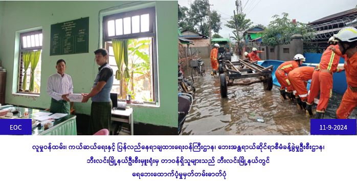 လူမှုဝန်ထမ်း၊ ကယ်ဆယ်ရေးနှင့် ပြန်လည်နေရာချထားရေးဝန်ကြီးဌာန၊ ဘေးအန္တရာယ်ဆိုင်ရာစီမံခန့်ခွဲမှုဦးစီးဌာန၊ ဘီးလင်းမြို့နယ်ဦးစီးမှူးရုံးမှ တာဝန်ရှိသူများသည် (၁၀-၉-၂၀၂၄) ရက်နေ့တွင် ဘီးလင်းမြို့နယ်အတွင်း မိုးသည်းထန်စွာရွာသွန်း၍ ဘီးလင်းမြစ်ရေမြင့်တက်လာမှုကြောင့် ကယ်ဆယ်ရေးစခန်း (၃) ခုရှိ အိမ်ထောင်စု (၁၀၇) စုတို့မှ ကျား (၁၉၅ ) ဦး၊ မ (၂၁၇) ဦး၊ စုစုပေါင်းလူဦးရေ (၄၁၂) ဦးတို့အတွက် (၇) ရက်စာ ဆန်ရိက္ခာဖိုးထောက်ပံ့ငွေ (၈၆၅,၂၀ဝိ/-)အား (၁၁-၉-၂၀၂၄)ရက်နေ့ (၁၅:၀၀)နာရီအချိန်တွင် ဘီးလင်းမြို့နယ် သဘာဝဘေးအန္တရာယ်ဆိုင်ရာစီမံခန့်ခွဲမှုအဖွဲ့နှင့်အတူ ရေဘေးသင့်ပြည်သူများလက်ဝယ်အရောက် ထောက်ပံ့ပေးအပ်ခဲ့ပါကြောင်း သတင်းရရှိပါသည်။
