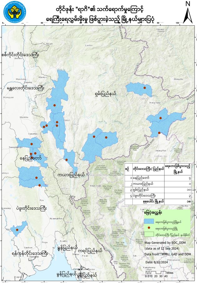 (၁၁-၉-၂၀၂၄) ရက်နေ့မှစ၍ မိုးသည်းထန်စွာရွာသွန်းခဲ့ခြင်းကြောင့် (၁၂-၉-၂၀၂၄) ရက်နေ့၊ နံနက် (၁၀:၀၀) နာရီတွင် ရရှိသောအချက်အလက်များအရ ပြည်ထောင်စုနယ်မြေ နေပြည်တော်၊ ရှမ်း ပြည်နယ်၊ ကယားပြည်နယ်နှင့် ပဲခူးတိုင်းဒေသကြီးတို့ရှိ မြို့နယ်စုစုပေါင်း (၁၈) မြို့နယ်တို့တွင် အိမ်ထောင်စု (၂၅,၀၀၀) ခန့်နှင့် ဘေးသင့်လူဦးရေ (၈၀,၀၀၀) ကျော် ရေဘေးသင့်ခဲ့ကြပြီး ရေဘေးရှောင်စခန်း (၅၀) ကျော် ဖွင့်လှစ်၍ ကယ်ဆယ်ထောက်ပံ့ရေးလုပ်ငန်းများ ဆောင်ရွက်လျက်ရှိပါသည်။