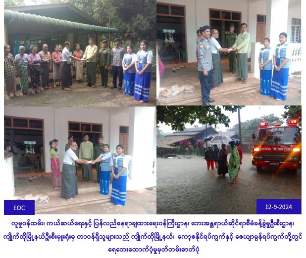 လူမှုဝန်ထမ်း၊ ကယ်ဆယ်ရေးနှင့် ပြန်လည်နေရာချထားရေးဝန်ကြီးဌာန၊ ဘေးအန္တရာယ်ဆိုင်ရာစီမံခန့်ခွဲမှုဦးစီးဌာန၊ ကျိုက်ထိုမြို့နယ်ဦးစီးမှူးရုံးမှတာဝန်ရှိသူများသည် (၇-၉-၂၀၂၄) ရက်နေ့မှ (၁၁-၉-၂၀၂၄) ရက်နေ့အထိ ကျိုက်ထိုမြို့နယ်အတွင်း မိုးများအဆက်မပြတ်ရွာသွန်း၍ တောင်ကျရေများစီးဆင်းပြီး ကဒတ်ချောင်းရေလျှံမှုကြောင့် ကယ်ဆယ်ရေးစခန်းဖွင့်လှစ်ထားရှိသော ကျိုက်ထိုမြို့နယ်၊ ကော့စနိုင်ရပ်ကွက်၊ တောရဘုန်းကြီးကျောင်းဓမ္မာရုံနှင့် ဇေယျာမွန်ရပ်ကွက်၊ တောရရွှေဂူကျောက်ကွင်း ဘုန်းတော်ကြီး ကျောင်းဓမ္မာရုံများသို့ ယာယီပြောင်းရွှေ့ရောက်ရှိလာသော စုစုပေါင်းအိမ်ထောင်စု (၁၄၄) စု၊ လူဦးရေ (၅၃၉) ဦးအတွက် (၇) ရက်စာ ဆန်ရိက္ခာဖိုးထောက်ပံ့ငွေ (၁,၁၃၁,၉၀၀ိ/-) အား (၁၂-၉-၂၀၂၄) ရက်နေ့၊ (၁၄:၃၀) နာရီအချိန်တွင် သက်ဆိုင်ရာတာဝန်ရှိသူများနှင့်အတူ ဘေးသင့်ပြည်သူများ၏ လက်ဝယ်အရောက် ထောက်ပံ့ပေးအပ်ခဲ့ကြောင်း သတင်းရရှိပါသည်။