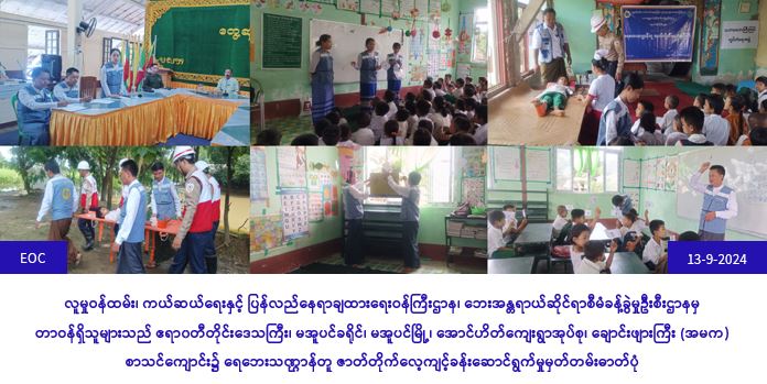 လူမှုဝန်ထမ်း၊ ကယ်ဆယ်ရေးနှင့်ပြန်လည်နေရာချထားရေးဝန်ကြီးဌာန၊ ဘေးအန္တရာယ်ဆိုင်ရာစီမံခန့်ခွဲမှု ဦးစီးဌာနမှ တာ၀န်ရှိသူများသည် (၁၃-၉-၂၀၂၄)ရက်နေ့တွင် ဧရာ၀တီတိုင်းဒေသကြီး၊ မအူပင်ခရိုင်၊ မအူပင်မြို့၊ အောင်ဟိတ်ကျေးရွာအုပ်စု၊ ချောင်းဖျားကြီး (အမက) စာသင်ကျောင်း၌ ၂၀၂၄ ခုနှစ်၊ အောက်တိုဘာလ (၁၃) ရက်နေ့တွင် ကျရောက်သော အပြည်ပြည်ဆိုင်ရာ သဘာ၀ဘေးအန္တရာယ် ထိခိုက်ဆုံးရှုံးနိုင်ခြေလျော့ချရေးနေ့အထိမ်းအမှတ်အားကြိုဆိုသောအနေဖြင့် မျိုးဆက်သစ်ကျောင်းနေ အရွယ်ကလေးများနှင့် လူငယ်များ ရေဘေးအန္တရာယ်အားသိရှိ၍ ကြိုတင်ပြင်ဆင်ခြင်းနှင့် ထိခိုက်မှုလျော့နည်းသက်သာစေရေးကိုအသင့်ဖြစ်စေရန်အတွက် ရေဘေးသဏ္ဍန်တူ ဇာတ်တိုက်လေ့ကျင့်ခြင်းကို မြို့နယ်သဘာ၀ဘေးအန္တရာယ်ဆိုင်ရာစီမံခန့်ခွဲမှုအဖွဲ့မှ တာ၀န်ရှိဌာနဆိုင်ရာ၀န်ထမ်းများ၊ ကြက်ခြေနီတပ်ဖွဲ့၀င်များ၊ (အမက)ချောင်းဖျားကြီးမှ ဆရာ/ဆရာမများနှင့် ကျောင်းသား/ကျောင်းသူများ၊ ကျေးရွာ အဖွဲ့အစည်းများနှင့် ကျေးရွာနေပြည်သူများကအတူတကွ ပူးပေါင်းဆောင်ရွက်ခဲ့ကြပြီး စုစုပေါင်းအင်အား (၃၀၀) ဦး ပါ၀င်ဆောင်ရွက်ခဲ့ပါကြောင်း သတင်းရရှိပါသည်။