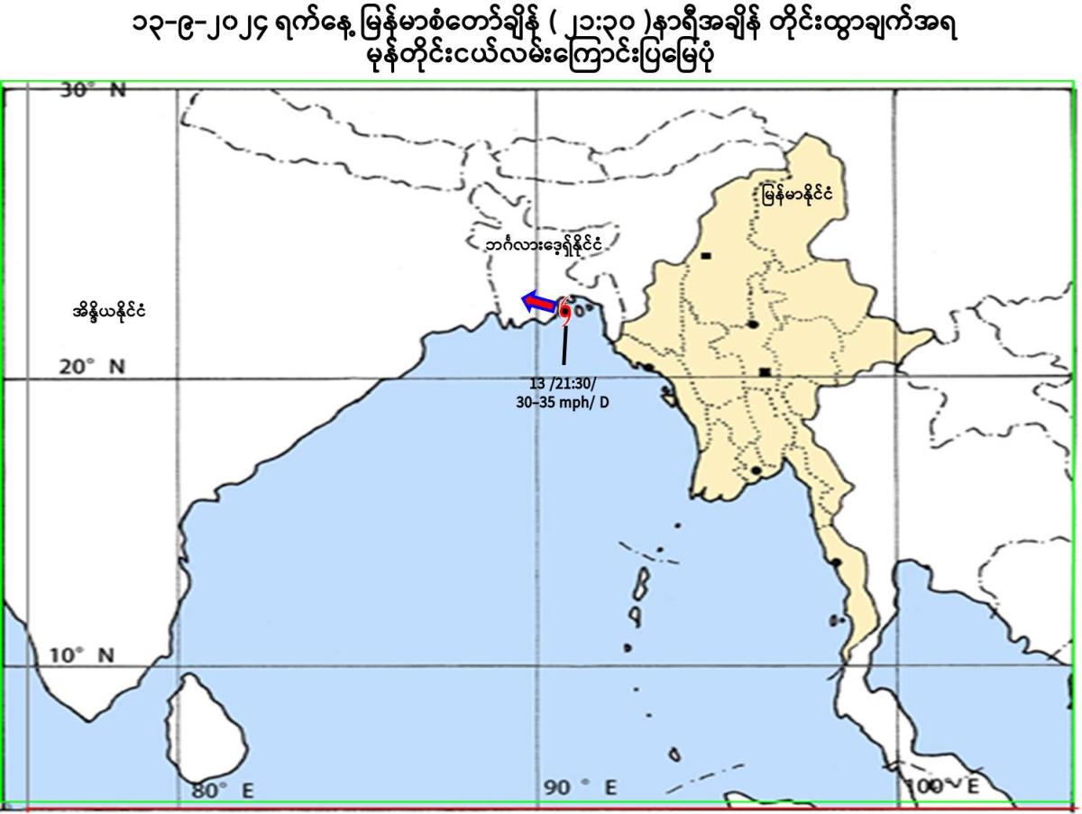 (၁) ယနေ့မြန်မာစံတော်ချိန် (၂၁:၃၀)နာရီအချိန် တိုင်းထွာချက်များအရ ဘင်္ဂလား ပင်လယ်အော်အရှေ့မြောက်ပိုင်းနှင့် ယင်းနှင့်ဆက်စပ်လျက်ရှိသော ဘင်္ဂလားဒေ့ရှ် နိုင်ငံအရှေ့တောင်ပိုင်းကမ်းခြေတို့တွင် ဖြစ်ပေါ်နေသော အားကောင်းသော လေဖိအားနည်းရပ်ဝန်း (Well Marked Low Pressure Area)သည် အနောက်- အနောက်မြောက်ဘက်သို့ ရွေ့လျားခဲ့ပြီး၊ ပိုမိုအားကောင်းလာကာ မုန်တိုင်းငယ် (Depression)အဖြစ်သို့ ရောက်ရှိခဲ့ပါသည်။ အဆိုပါ မုန်တိုင်းငယ်သည် မြန်မာ နိုင်ငံ၊ မောင်တောမြို့(Maungdaw)၏ အနောက်မြောက်ဘက် ရေမိုင် ၁၁၅ မိုင်ခန့်၊ စစ်တွေမြို့(Sittwe)၏ အနောက်မြောက်ဘက် ရေမိုင် ၁၆၀ မိုင်ခန့်၊ ဘင်္ဂလားဒေ့ရှ် နိုင်ငံ၊ ပတ်တု(အ)ခါလီမြို့(Patuakhali)၏ အရှေ့တောင်ဘက် ရေမိုင် ၃၀ မိုင်ခန့်၊ အိန္ဒိယနိုင်ငံ၊ ကန်နင်းမြို့(Canning)၏ အရှေ့ဘက် ရေမိုင် ၁၂၀ မိုင်ခန့်နှင့် ကိုးလ်ကတ္တားမြို့(Kolkata)၏ အရှေ့-အရှေ့တောင်ဘက် ရေမိုင် ၁၄၀ မိုင်ခန့် အကွာ ပင်လယ်ပြင်ကို ဗဟိုပြုနေပါသည်။