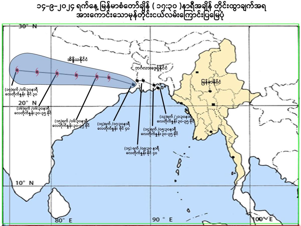 ယနေ့မြန်မာစံတော်ချိန် (၁၇:၃၀)နာရီအချိန် တိုင်းထွာချက်များအရ အိန္ဒိယနိုင်ငံ၊ အနောက်ဘင်္ဂလားပြည်နယ်နှင့် ယင်းနှင့်ဆက်စပ်လျက်ရှိသော ဘင်္ဂလားဒေ့ရှ်နိုင်ငံတို့ တွင် ဖြစ်ပေါ်နေသော အားကောင်းသောမုန်တိုင်းငယ်(Deep Depression)သည် အနောက် -အနောက်တောင်ဘက်သို့ ရွေ့လျားခဲ့ပြီး၊ အိန္ဒိယနိုင်ငံ၊ အနောက်ဘင်္ဂလားပြည်နယ် ကုန်းတွင်းပိုင်းဒေသများသို့ ဆက်လက်ဖြတ်ကျော်လျက်ရှိပါသည်။