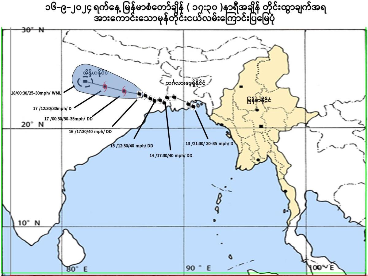 ယနေ့မြန်မာစံတော်ချိန် (၀၅:၃၀) နာရီအချိန် တိုင်းထွာချက်များအရ အိန္ဒိယနိုင်ငံ၊ အနောက် ဘင်္ဂလားပြည်နယ်ကုန်းတွင်းပိုင်းဒေသများတွင် ဖြစ်ပေါ်ခဲ့သော အားကောင်းသောမုန်တိုင်းငယ် (Deep Depression) သည် အနောက်ဘက်သို့ ဖြည်းညှင်းစွာရွေ့လျားခဲ့ပြီး၊ အိန္ဒိယနိုင်ငံ၊ ဂျက်ခမ်း ပြည်နယ်သို့ ရောက်ရှိခဲ့ကာ ဆက်လက်တည်ရှိနေပါသည်။