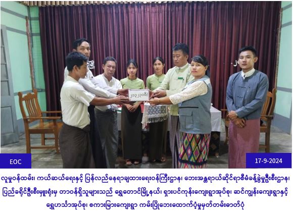 လူမှုဝန်ထမ်း၊ ကယ်ဆယ်ရေးနှင့် ပြန်လည်နေရာချထားရေးဝန်ကြီးဌာန၊ ဘေးအန္တရာယ်ဆိုင်ရာစီမံခန့်ခွဲမှုဦးစီးဌာန၊ ပြည်ခရိုင်ဦးစီးမှူးရုံးမှ တာဝန်ရှိသူများသည် (၁၆-၉-၂၀၂၄) ရက်နေ့တွင် ဧရာဝတီမြစ်ရေ တိုက်စားမှုကြောင့် ရွှေတောင်မြို့နယ်၊ ရှားပင်ကုန်းကျေးရွာအုပ်စု၊ ဆင်ကျွန်းကျေးရွာနှင့် ရွှေဟင်္သာအုပ်စု၊ စကားမြားကျေးရွာတို့မှ ကမ်းပြိုဘေးသင့်ကြိုတင်ဖျက်သိမ်းနေအိမ် (၂၀) လုံးအတွက် ပြောင်းရွှေ့စရိတ် ထောက်ပံ့ငွေ (၂,၀၀၀,၀၀ဝိ/-)၊ လူဦးရေ (၆၃) ဦးအတွက် ဆန်ရိက္ခာဖိုးထောက်ပံ့ငွေ (၁၃၂,၃၀ဝိ/-) တို့အား (၁၇-၉-၂၀၂၄) ရက်နေ့၊ နံနက် (၁၁:၃၀) နာရီအချိန်တွင် ဘေးသင့်ပြည်သူများ၏ လက်ဝယ်အရောက် ထောက်ပံ့ပေးအပ်ခဲ့ကြောင်း သတင်းရရှိပါသည်။