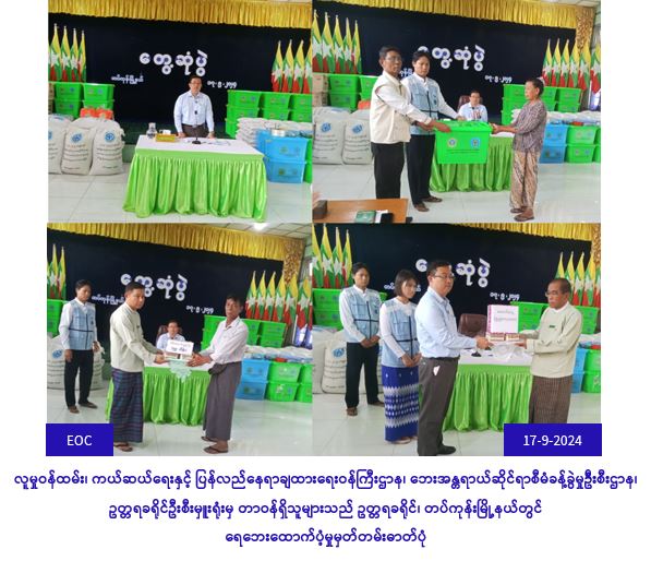 လူမှုဝန်ထမ်း၊ ကယ်ဆယ်ရေးနှင့် ပြန်လည်နေရာချထားရေးဝန်ကြီးဌာန၊ ဘေးအန္တရာယ်ဆိုင်ရာစီမံခန့်ခွဲမှုဦးစီးဌာန၊ ဥတ္တရခရိုင်ဦးစီးမှူးရုံးမှ တာဝန်ရှိသူများသည် ပြည်ထောင်စုနယ်မြေ၊ နေပြည်တော်၊ ဥတ္တရခရိုင်၊ တပ်ကုန်းမြို့နယ်တွင် (၁၁-၉-၂၀၂၄) ရက်နေ့တွင် ဖြစ်ပွားခဲ့သောရေဘေးကြောင့် သေဆုံးလူဦးရေ (၃၃) ဦးအတွက် ထောက်ပံ့ငွေ(၉,၉၀၀,၀၀၀/-)၊ လုံးဝပျက်စီးနေအိမ် (၅၉) လုံးအတွက် အိမ်ဆောက်ပစ္စည်းဖိုး ထောက်ပံ့ငွေ (၅,၉၀၀,၀၀၀/-)၊ ဘေးသင့်လူဦးရေ (၆,၉၇၃) ဦးအတွက် ဆန်ရိက္ခာဖိုး ထောက်ပံ့ငွေ (၁၄,၆၄၃,၃၀၀/-)၊ စုစုပေါင်းထောက်ပံ့ငွေ (၃၀,၄၄၃,၃၀၀/-) နှင့်ကယ်ဆယ်ရေးပစ္စည်း (၁၆) မျိုး (၅၉) အိမ်ထောင်စုစာ (၆,၃၅၃,၀၀၂/-)၊ တို့အား နေပြည်တော်ကောင်စီဝင် ဦးဇေယျာလင်း နှင့်အတူ (၁၇-၉-၂၀၂၄) ရက်နေ့၊ (၁၁း၃၀) အချိန်တွင် ဘေးသင့်ပြည်သူများလက်ဝယ်သို့ သွားရောက် ထောက်ပံ့ပေးအပ်ခဲ့ကြောင်း သတင်းရရှိပါသည်။