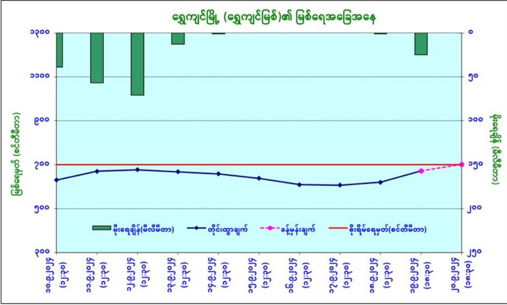 ၂၀၂၄ ခုနှစ်၊ စက်တင်ဘာလ ၁၉ ရက်နေ့၊ နံနက် (၁၈:၃၀) နာရီအချိန် တိုင်းထွာချက်အရ ရွှေကျင်မြစ်ရေသည် ရွှေကျင်မြို့တွင် ယင်းမြို့၏စိုးရိမ်ရေမှတ်အောက် ၁ ပေခန့်တွင် ရောက်ရှိနေပါသည်။ အဆိုပါမြစ်ရေသည် နောက် ၁ ရက်အတွင်း ယင်းမြို့၏စိုးရိမ်ရေမှတ်သို့ ရောက်ရှိနိုင်ပါသည်။