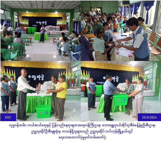 လူမှုဝန်ထမ်း၊ ကယ်ဆယ်ရေးနှင့် ပြန်လည်နေရာချထားရေးဝန်ကြီးဌာန၊ ဘေးအန္တရာယ်ဆိုင်ရာစီမံခန့်ခွဲမှုဦးစီးဌာန၊ နေပြည်တော်ကောင်စီဝင် ဦးဇေယျာလင်းနှင့်အတူ ဥတ္တရခရိုင်ဦးစီးမှူးရုံးမှ တာဝန်ရှိသူများသည် ပြည်ထောင်စုနယ်မြေ၊ နေပြည်တော်၊ ဥတ္တရခရိုင်၊ တပ်ကုန်းမြို့နယ်တွင် (၁၁-၉-၂၀၂၄) ရက်နေ့တွင်ဖြစ်ပွားခဲ့သောရေဘေးကြောင့် သေဆုံးလူဦးရေ (၉၇) ဦးအတွက်ထောက်ပံ့ငွေ ( ၂၉,၁၀၀,၀၀၀/-)၊ လုံးဝပျက်စီးနေအိမ် (၄၁၃) လုံးအတွက် အိမ်ဆောက်ပစ္စည်းဖိုးထောက်ပံ့ငွေ (၄၁,၃၀၀,၀၀၀/-)၊ စုစုပေါင်းထောက်ပံ့ငွေ (၇၀,၄၀၀,၀၀၀/-) နှင့်ကယ်ဆယ်ရေးပစ္စည်း (၁၆) မျိုး (၁၀၇,၆၇၈/-)၊ (၄၁၃) အိမ်ထောင်စုစာ (၄၄,၄၇၁,၀၁၄/-) တို့အား (၂၀-၉-၂၀၂၄) ရက်နေ့၊ (၁၄:၀၀) အချိန်တွင်ဘေးသင့်ပြည်သူများလက်ဝယ်သို့ သွားရောက် ထောက်ပံ့ပေးအပ်ခဲ့ပါကြောင်း သတင်းရရှိပါသည်။