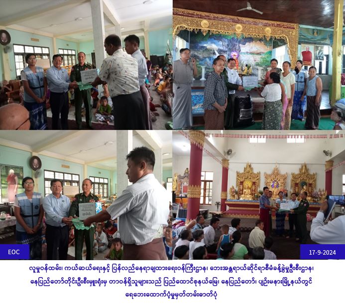 လူမှုဝန်ထမ်း၊ ကယ်ဆယ်ရေးနှင့် ပြန်လည်နေရာချထားရေးဝန်ကြီးဌာန၊ ဘေးအန္တရာယ်ဆိုင်ရာစီမံခန့်ခွဲမှု ဦးစီးဌာန၊ နေပြည်တော်တိုင်းဦးစီးမှူးရုံးမှ တာဝန်ရှိသူများသည် (၁၁-၉-၂၀၂၄) ရက်နေ့တွင် မိုးသည်းထန်စွာ ရွာသွန်းမှုကြောင့် ပျဥ်းမနားမြို့နယ်ရှိ ဘေးသင့်လူဦးရေ (၃,၀၇၆) ဦးအတွက် ဆန်ရိက္ခာဖိုးထောက်ပံ့ငွေ (၆,၄၅၉,၆၀၀/-) အား (၁၇-၉-၂၀၂၄) ရက်နေ့တွင် နေပြည်တော်ကောင်စီဝင်များ၊ သက်ဆိုင်ရာ တာဝန်ရှိသူ များနှင့်အတူ ထောက်ပံ့ပေးအပ်ခဲ့ကြောင်း သတင်းရရှိပါသည်။
