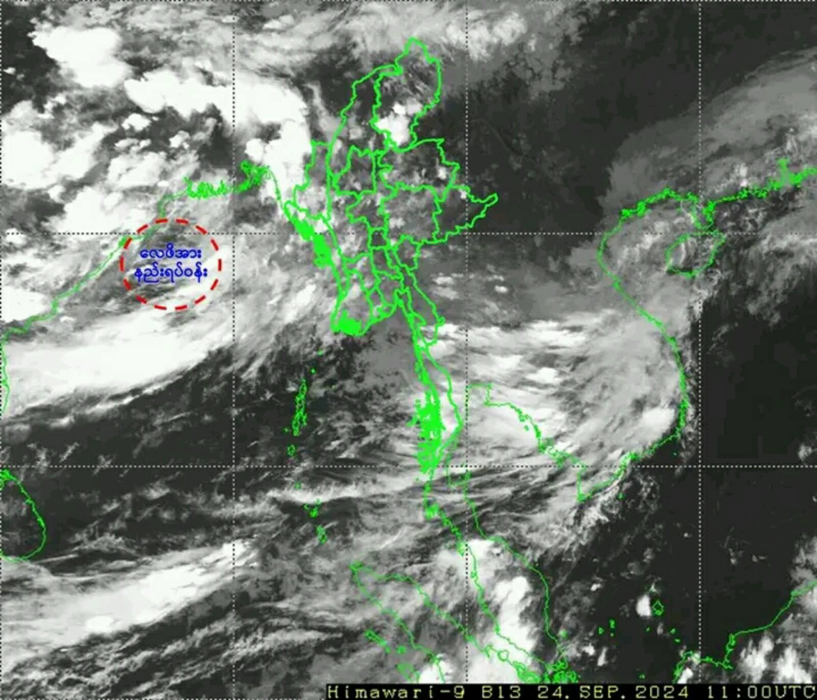 ၂၀၂၄ ခုနှစ်၊ စက်တင်ဘာလ (၂၄) ရက်နေ့ မြန်မာစံတော်ချိန် (၁၉:၀၀) နာရီအချိန်တွင် မိုးလေဝသနှင့် ဇလဗေဒညွှန်ကြားမှုဦးစီးဌာနမှ “လေဖိအားနည်းရပ်ဝန်းအခြေအနေ” ကို အောက်ပါအတိုင်း ထုတ်ပြန် ထားပါသည်-