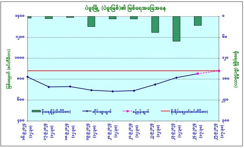ယနေ့မြန်မာစံတော်ချိန် (၁၇:၃၀)နာရီအချိန် တိုင်းထွာချက်အရ ပဲခူးမြစ်ရေသည် ပဲခူးမြို့တွင် ယင်းမြို့၏ စိုးရိမ်ရေမှတ်အောက် ၁ ပေခန့်တွင် ရောက်ရှိနေပါသည်။ အဆိုပါမြစ်ရေသည် နောက် (၁) ရက်အတွင်း ယင်းမြို့၏ စိုးရိမ်ရေမှတ်သို့ ရောက်ရှိနိုင်ပါသည်။