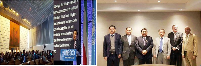 ၂၀၁၆ခုနှစ်၊ ဒီဇင်ဘာလ (၂) ရက်နေ့တွင် လူမှုဝန်ထမ်း၊ ကယ်ဆယ်ရေးနှင့်ပြန်လည် နေရာချထားရေးဝန်ကြီးဌာန၊ ပြည်ထောင်စုဝန်ကြီး ဒေါက်တာဝင်းမြတ်အေးခေါင်းဆောင်သော မြန်မာကိုယ်စားလှယ်အဖွဲ့သည် ပြင်သစ်နိုင်ငံ၊ ပဲရစ်မြို့ ယူနက်စကိုရုံးချုပ်တွင် ကျင်းပ ပြုလုပ်သော မသန်စွမ်းသူများအခွင့်အရေးဆိုင်ရာ ကုလသမသဘောတူစာချုပ် (၁၀) နှစ် ပြည့် အထိမ်းအမှတ်အခမ်းအနားသို့ တက်ရောက်ခဲ့ပါသည်။