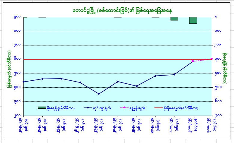 ယနေ့မြန်မာစံတော်ချိန် (၀၇:၃၀) နာရီအချိန် တိုင်းထွာချက်အရ စစ်တောင်းမြစ်ရေသည် တောင်ငူမြို့တွင် ယင်းမြို့၏ စိုးရိမ်ရေမှတ်အောက် ပေဝက်ခန့်တွင် ရောက်ရှိနေပါသည်။ အဆိုပါ မြစ်ရေသည် နောက် (၁) ရက်အတွင်း ယင်းမြို့၏ စိုးရိမ်ရေမှတ်သို့ ရောက်ရှိနိုင်ပါသည်။