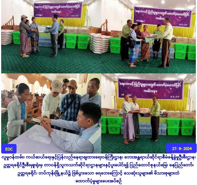 လူမှု၀န်ထမ်း၊ ကယ်ဆယ်ရေးနှင့်ပြန်လည်နေရာချထားရေး၀န်ကြီးဌာန၊ ဘေးအန္တရာယ်ဆိုင်ရာစီမံခန့်ခွဲမှုဦးစီးဌာန၊ ဥတ္တရခရိုင် ဦးစီးမှူးရုံးမှ တာ၀န်ရှိသူများသည် ပြည်ထောင်စုနယ်မြေ၊ နေပြည်တော်၊ ဥတ္တရခရိုင်၊ တပ်ကုန်းမြို့နယ်တွင် (၁၁.၉.၂၀၂၄) ရက်နေ့တွင်ဖြစ်ပွားခဲ့သော ရေဘေးကြောင့် သေဆုံးခဲ့သည့်လူ(၁၀၀)ဦ းအတွက် နိုင်ငံတော်မှတစ်ဦးလျှင် (၅)သိန်းနှုန်းဖြင့် သိန်း(၅၀၀) ကျပ်၊ နေပြည်တော်ကောင်စီမှတစ်ဦးလျှင် (၂)သိန်းနှုန်းဖြင့် သိန်း (၂၀၀)ကျပ်၊ စုစုပေါင်းသိန်း( ၇၀၀)ကျပ်တို့အား၊ နေပြည်တော်ကောင်စီဝင် ဦးဇေယျာလင်း၊ ဥတ္တရခရိုင်စီမံအုပ်ချုပ်ရေးအဖွဲ့ဥက္ကဌ ဦးကျော်စွာထွန်း၊ တပ်ကုန်းမြို့နယ်အထွေထွေ အုပ်ချုပ်ရေး ဦးစီးဌာနမှ မြို့နယ်အုပ်ချုပ်ရေးမှူး ဦးညီညီထွေး၊ (၂၇.၉.၂၀၂၄)ရက်နေ့ (၁၀း၀၀)အချိန်တွင် ဘေးသင့်ပြည်သူများ လက်ဝယ်သို့ သွားရောက်ထောက်ပံ့ပေးအပ်ခဲ့ပါကြောင်း သတင်းရရှိပါသည်။