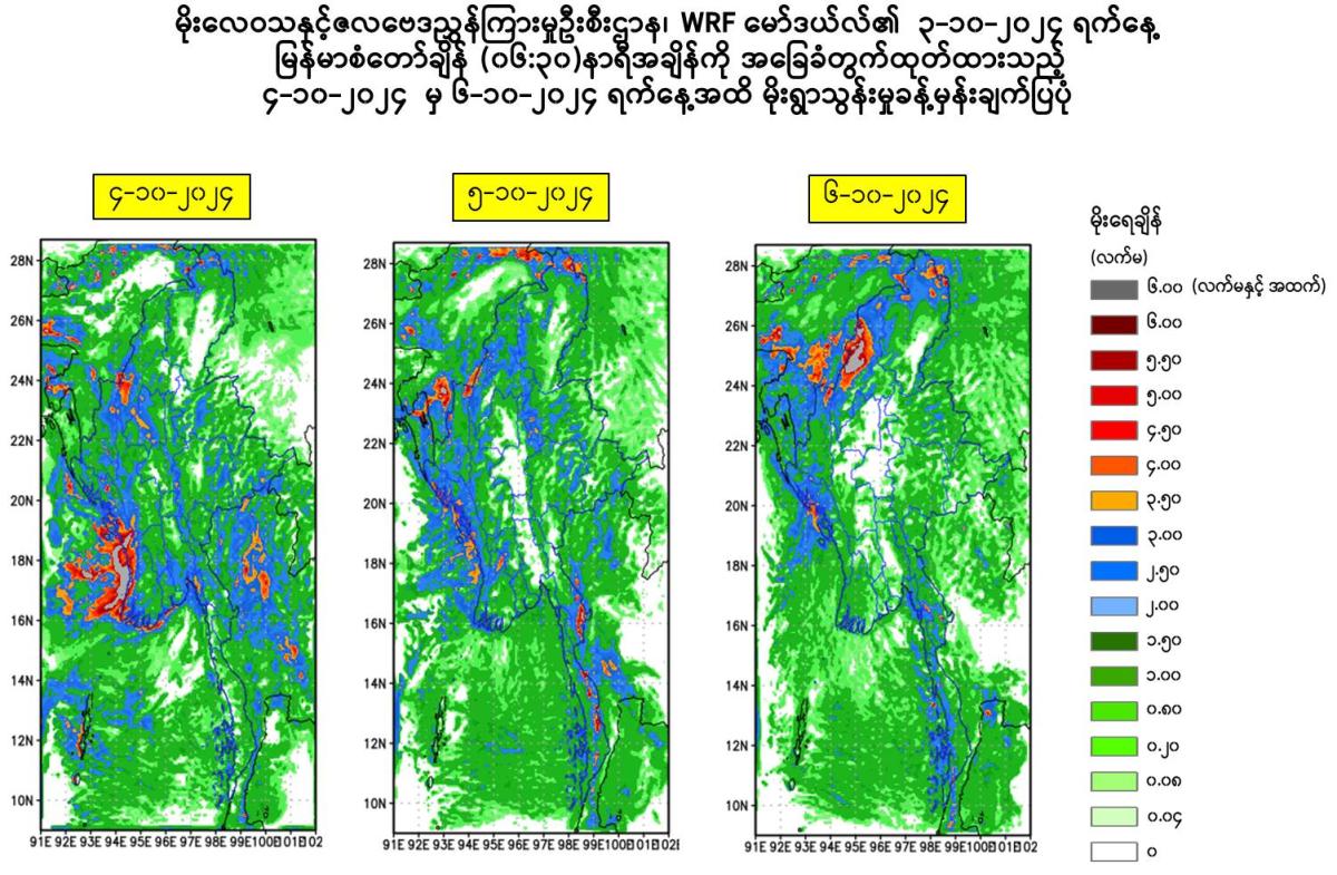 ၁။ ယနေ့မြန်မာစံတော်ချိန် (၁၇:၃၀)နာရီအချိန် တိုင်းထွာချက်များအရ အနောက်ဘက်မှ ရွေ့လျားလာသော လေပွေလှိုင်းများ၏အရှိန်ကြောင့်လည်းကောင်း၊ အပူပျံတက်တိမ်များ ဖြစ်ထွန်းမှု အားကောင်းခြင်းကြောင့်လည်းကောင်း၊ ဘင်္ဂလားဒေ့ရှ်နိုင်ငံအရှေ့တောင်ပိုင်းတွင် ဖြစ်ပေါ်နေသော လေဖိအားနည်းဆဲလ်၏အရှိန်ကြောင့်လည်းကောင်း၊ အရှေ့ဘက်မှရွေ့လျားလာသော တိမ်တိုက်များကြောင့်လည်းကောင်း ယနေ့ညမှ (၆-၁၀-၂၀၂၄) ရက်နေ့အတွင်း စစ်ကိုင်းတိုင်းဒေသကြီး၊ ဧရာဝတီတိုင်းဒေသကြီး၊ တနင်္သာရီတိုင်းဒေသကြီး၊ ကချင်ပြည်နယ်၊ ချင်းပြည်နယ်၊ ရခိုင်ပြည်နယ်၊ ကရင်ပြည်နယ်နှင့် မွန်ပြည်နယ်တို့တွင် နေရာအနှံ့အပြား မိုးထစ်ချုန်းရွာပြီး၊ အချို့ဒေသများတွင် ဒေသအလိုက်နှင့် နေရာ ကွက်၍ မိုးကြီးခြင်းများနှင့်အတူ လေပြင်းတိုက်ခတ်ခြင်းများ ဖြစ်ပေါ်နိုင်ကာ၊ နေပြည်တော်၊ မန္တလေးတိုင်းဒေသကြီး၊ မကွေးတိုင်းဒေသကြီး၊ ပဲခူးတိုင်းဒေသကြီး၊ ရန်ကုန်တိုင်းဒေသကြီး၊ ရှမ်းပြည်နယ်နှင့် ကယားပြည်နယ်တို့တွင် နေရာကျဲကျဲမှ နေရာစိပ်စိပ် မိုးထစ်ချုန်းရွာနိုင်ပါသည်။