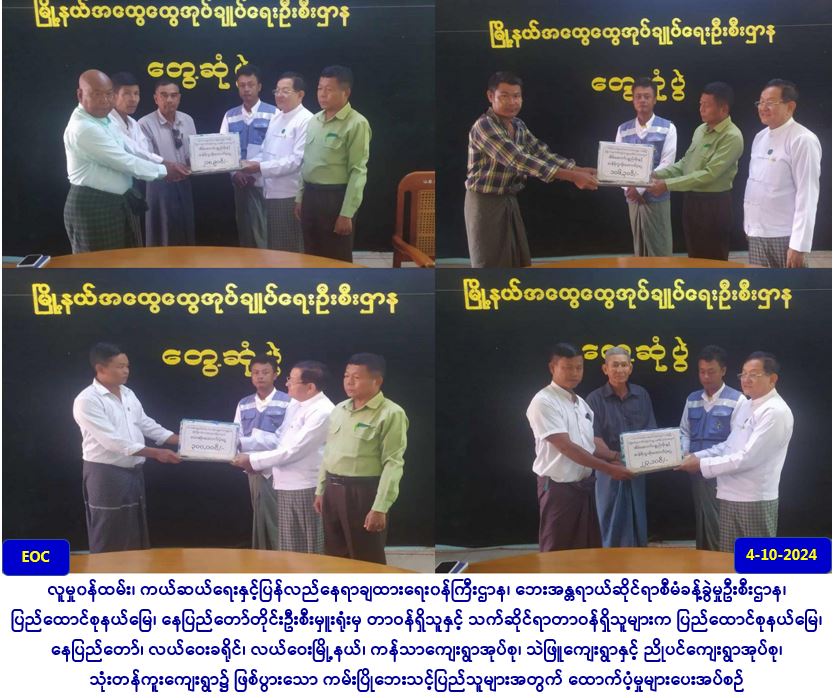 လူမှု၀န်ထမ်း၊ ကယ်ဆယ်ရေးနှင့်ပြန်လည်နေရာချထားရေး၀န်ကြီးဌာန၊ ဘေးအန္တရာယ်ဆိုင်ရာစီမံခန့်ခွဲမှုဦးစီးဌာန၊ ပြည်ထောင်စုနယ်မြေ၊ နေပြည်တော်တိုင်းဦးစီးမှူးရုံးမှ တာဝန်ရှိသူများသည် ပြည်ထောင်စုနယ်မြေ၊ နေပြည်တော်၊ လယ်ဝေးခရိုင်၊ လယ်ဝေးမြို့နယ်၊ ကန်သာကျေးရွာအုပ်စု၊ သဲဖြူကျေးရွာနှင့် ညိုပင်ကျေးရွာအုပ်စု၊ သုံးတန်ကူးကျေးရွာ၌ (၂၀.၉.၂၀၂၄) ရက်နေ့တွင် ဖြစ်ပွားခဲ့သော ကမ်းပြိုဘေးကြောင့် ပြောင်းရွေ့နေအိမ် (၄)လုံးအတွက် အိမ်ဆောက်ပစ္စည်းဖိုးငွေ (၄၀၀,၀၀ဝိ/-)၊ ဘေးသင့်လူဦးရေ (၂၀) ဦး အတွက် ဆန်ရိက္ခာဖိုးထောက်ပံ့ငွေ (၄၂,၀၀ဝိ/-)၊ သစ်ကြိမ်း ကျေးရွာအုပ်စု၊ ဟေမာန်ကျေးရွာ၌ (၁.၁၀.၂၀၂၄) ရက်နေ့တွင် ဖြစ်ပွားခဲ့သော ကမ်းပြိုဘေးကြောင့်ဖျက်သိမ်းပြောင်းရွေ့နေအိမ် (၁)လုံးအတွက် အိမ်ဆောက်ပစ္စည်းဖိုးငွေ (၁၀၀,၀၀ဝိ/-)၊ ဘေးသင့်လူဦးရေ (၃)ဦးအတွက် ဆန်ရိက္ခာဖိုးငွေ (၆,၃၀ဝိ/-)၊သစ်ပုတ်ပင်ကျေးရွာအုပ်စု၊ အမှတ်(၄)ရပ်ကွက်တွင်ဖြစ်ပွားခဲ့သော ကမ်းပြိုဘေးကြောင့် ဖျက်သိမ်းပြောင်းရွှေ့နေအိမ် (၂)လုံးအတွက် အိမ်ဆောက်ပစ္စည်းဖိုးငွေ (၂၀၀,၀၀ဝိ/-)၊ ဘေးသင့်လူဦးရေ (၁၁)ဦး အတွက် ဆန်ရိက္ခာဖိုးထောက်ပံ့ငွေ (၂၃,၁၀ဝိ/-)နှင့် ပေတုန်းမျှောင်ကျေးရွာတွင် ဖြစ်ပွားခဲ့သော မိုးကြိုးဘေးကြောင့် သေဆုံးသူ (၁)ဦးအတွက် ထောက်ပံ့ငွေ (၃၀၀,၀၀ဝိ/-)၊ စုစုပေါင်းထောက်ပံ့ငွေ (၁,၀၇၁,၄၀ဝိ/-)တို့အား နေပြည်တော်ကောင်စီဝင် ဦးမြင့်စိုးနှင့်အတူ (၄-၁၀-၂၀၂၄) ရက်နေ့၊ (၁၁:၃၀)အချိန်တွင် ဘေးသင့်ပြည်သူများလက်ဝယ်သို့ သွားရောက်ထောက်ပံ့ပေးအပ်ခဲ့ပါကြောင်း သတင်းရရှိပါသည်။