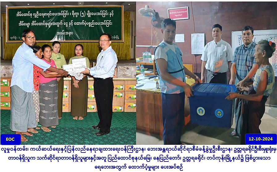 လူမှု၀န်ထမ်း၊ ကယ်ဆယ်ရေးနှင့်ပြန်လည်နေရာချထားရေး၀န်ကြီးဌာန၊ ဘေးအန္တရာယ်ဆိုင်ရာစီမံခန့်ခွဲမှုဦးစီးဌာန၊ ဥတ္တရခရိုင်ဦးစီးမှူးရုံးမှ တာဝန်ရှိသူများသည် ပြည်ထောင်စုနယ်မြေ၊ နေပြည်တော်၊ ဥတ္တရခရိုင်၊ တပ်ကုန်းမြို့နယ်၌ (၁၁-၉-၂၀၂၄)ရက်နေ့တွင် ဖြစ်ပွားခဲ့သော ရေဘေးကြောင့် လုံးဝပျက်စီးနေအိမ် (၃၀၇)လုံးအတွက် အိမ်ဆောက်ပစ္စည်းဖိုးထောက်ပံ့ငွေ (၃၀၇၀၀၀၀၀/-)၊ ကယ်ဆယ်ရေးပစ္စည်း (၁၆) မျိုး (၁၀၇၆၇၈/-)၊ (၃၀၇) အိမ်ထောင်စုစာ (၃၃၀၅၇၁၄၆/-)နှင့် တစ်စိတ်တစ်ပိုင်းပျက်စီးနေအိမ် (၃၆၂)လုံးအတွက် အိမ်ဆောက်ပစ္စည်းဖိုးထောက်ပံ့ငွေ (၁၈၁၀၀၀၀၀/-) တို့အား နေပြည်တော်ကောင်စီဝင် ဦးဇေယျာလင်း၊ ဥတ္တရခရိုင်စီမံအုပ်ချုပ်ရေးအဖွဲ့ဥက္ကဌ ဦးမြတ်အောင်ဌေး၊ တပ်ကုန်းမြို့နယ် အထွေထွေအုပ်ချုပ်ရေးဦးစီးဌာနမှ မြို့နယ်အုပ်ချုပ်ရေးမှူး ဦးညီညီထွေး၊ ဌာနဆိုင်ရာမှ တာဝန်ရှိသူများနှင့်အတူ (၁၂-၁၀-၂၀၂၄) ရက်နေ့၊ (၁၁:၀၀) အချိန်တွင် ဘေးသင့်ပြည်သူများလက်ဝယ်သို့ သွားရောက်ထောက်ပံ့ပေးအပ်ခဲ့ပါကြောင်း သတင်းရရှိပါသည်။