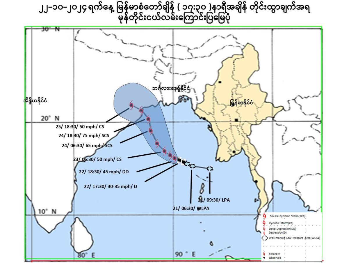 (၁) အဆိုပါ မုန်တိုင်းငယ်သည် အနောက်-အနောက်မြောက်ဘက်သို့ ရွေ့လျားနိုင်ပြီး၊ ပိုမို အားကောင်းလာနိုင်ကာ (၂၃-၁၀-၂၀၂၄) ရက်နေ့တွင် ဆိုင်ကလုန်းမုန်တိုင်း (Cyclonic Storm) အဖြစ်သို့လည်းကောင်း၊ (၂၄-၁၀-၂၀၂၄) ရက်နေ့တွင် ဘင်္ဂလားပင်လယ်အော် အနောက်မြောက်ပိုင်းတွင် အားကောင်းသောဆိုင်ကလုန်းမုန်တိုင်း (Severe Cyclonic Storm) အဖြစ်သို့လည်းကောင်း ပိုမိုအားကောင်းလာနိုင်သည်ဟု ခန့်မှန်းရပါသည်။ ထိုမှတစ်ဆင့် အနောက်မြောက်ဘက်သို့ ရွေ့လျားနိုင်ပြီး၊ (၂၅-၁၀-၂၀၂၄) ရက်နေ့ နံနက် အစောပိုင်းတွင် အိန္ဒိယနိုင်ငံ၊ ဩရိဿပြည်နယ်မြောက်ပိုင်းနှင့် အနောက်ဘင်္ဂလား ပြည်နယ်ကမ်းခြေတို့ကို ပူရီမြို့ (Puri) နှင့် ဆာဂါကျွန်း (Sagar Island) တို့အကြားမှ ဖြတ်ကျော်နိုင်သည်ဟု ခန့်မှန်းရပါသည်။
