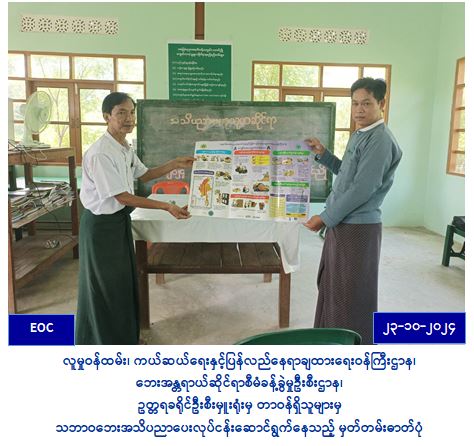 လူမှု၀န်ထမ်း၊ ကယ်ဆယ်ရေးနှင့် ပြန်လည်နေရာချထားရေး၀န်ကြီးဌာန၊ ဘေးအန္တရာယ်ဆိုင်ရာစီမံခန့်ခွဲမှုဦးစီးဌာန၊ ဥတ္တရခရိုင် ဦးစီးမှူးရုံးရှိ တာဝန်ရှိသူများမှ (၂၃-၁၀-၂၀၂၄) ရက်နေ့ (၁၀:၀၀) မှ (၁၂:၀၀) နာရီအချိန်ထိ ဥတ္တရခရိုင်၊ ဥတ္တရသီရိမြို့နယ်၊ (အ.ထ.က) တောင်ညိုအခြေခံပညာအထက်တန်းကျောင်း၌ ဌာနဆိုင်ရာများမှ အရာထမ်း/အမှုထမ်းများ၊ ဆရာ/ဆရာမများ၊ ကျောင်းသား/သူများ စုစုပေါင်း(၁၀၀)ဦးခန့်အား သဘာဝဘေးနှင့် ပတ်သက်၍ ဆောင်ရန်/ရှောင်ရန်အချက်များအား အသိပညာပေး မျှဝေခဲ့ပြီး လက်ကမ်းစာစောင်များနှင့် နံရံကပ်ပိုစတာတို့အားဝေငှခဲ့ကြောင်း သတင်းရရှိပါသည်။