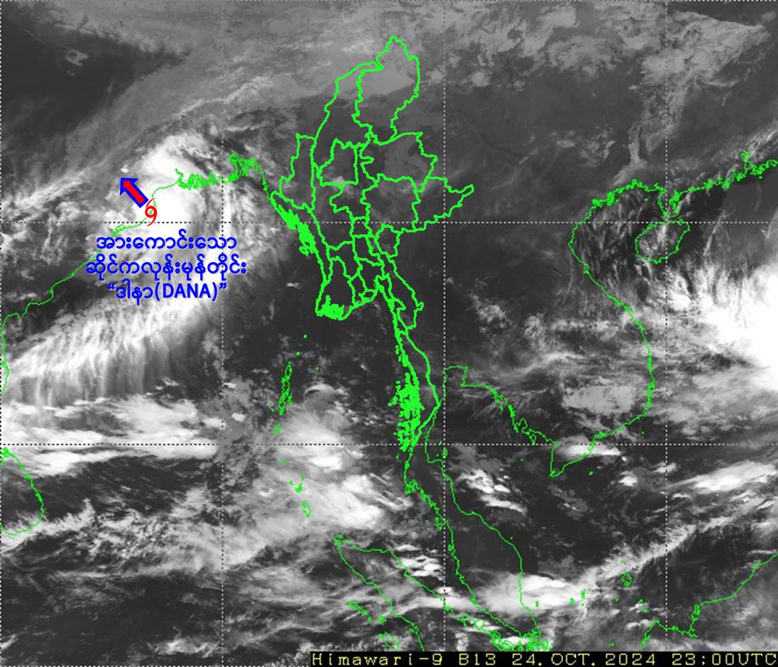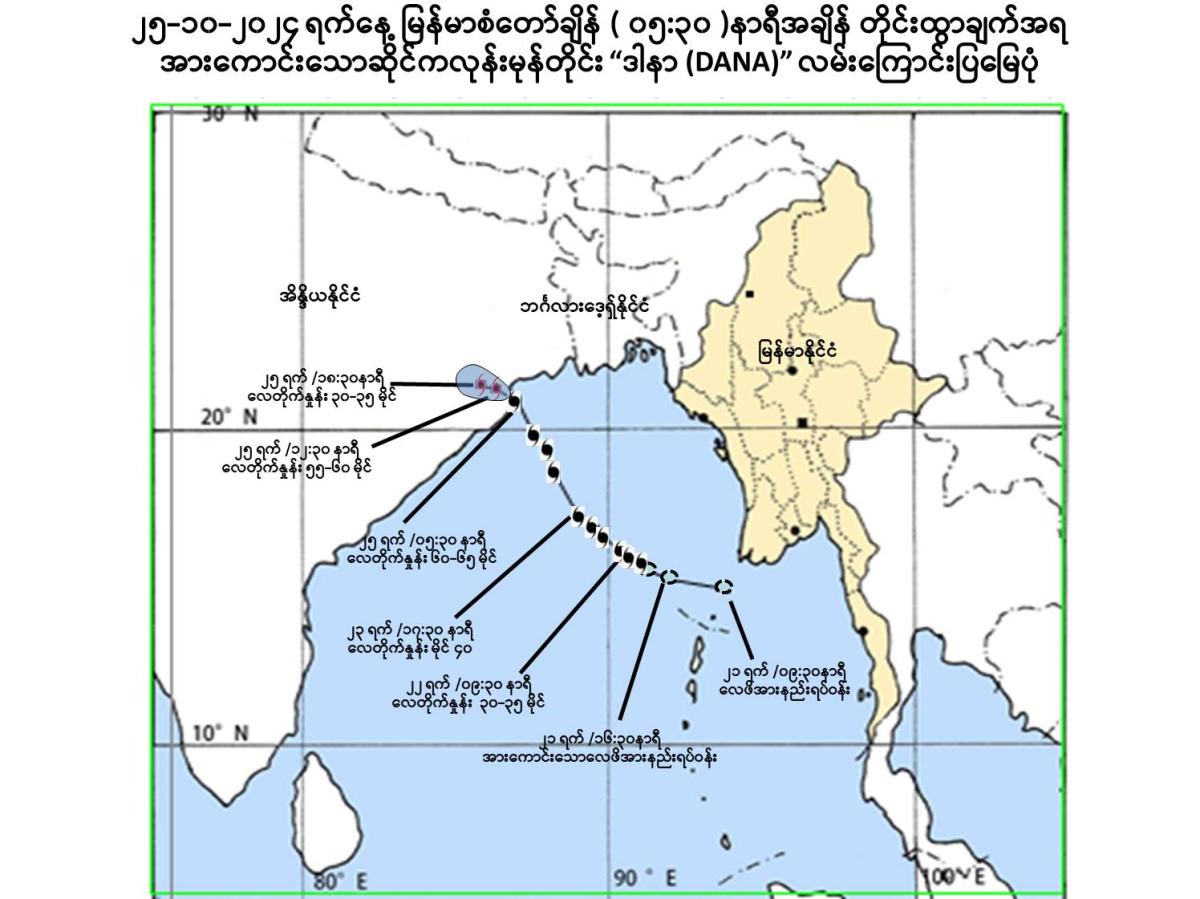 (၁) ယနေ့မြန်မာစံတော်ချိန် (၀၅:၃၀) နာရီအချိန် တိုင်းထွာချက်များအရ ဘင်္ဂလားပင်လယ် အော်အနောက်မြောက်ပိုင်းတွင် ဖြစ်ပေါ်နေသော အားကောင်းသောဆိုင်ကလုန်း မုန်တိုင်း“ဒါနာ”(DANA) သည် မြောက်-အနောက်မြောက်ဘက်သို့ရွေ့လျားခဲ့ပြီး၊ မုန်တိုင်း၏အဝန်းအဝိုင်းသည် အိန္ဒိယနိုင်ငံ၊ ဩရိဿပြည်နယ်မြောက်ပိုင်းနှင့် အနောက် ဘင်္ဂလားပြည်နယ်ကမ်းခြေတို့ကို ပူရီမြို့ (Puri)နှင့် ဆာဂါကျွန်း (Sagar Island) တို့ အကြား ဒမ်မရာမြို့ (Dhamara)အနီးမှ ဖြတ်ကျော်လျက်ရှိကာ၊ ယနေ့နံနက်ပိုင်းတွင် အိန္ဒိယနိုင်ငံ၊ ဩရိဿပြည်နယ်ကုန်းတွင်းပိုင်း ဒေသများကို ဆက်လက်ဖြတ်ကျော်နိုင် သည်ဟု ခန့်မှန်းရပါသည်။