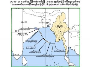 (၁) အားကောင်းသောဆိုင်ကလုန်းမုန်တိုင်း “ဒါနာ” ၏အရှိန်ကြောင့် ယနေ့နံနက်မှ နောက် (၁၂) နာရီအတွင်း စစ်ကိုင်းတိုင်းဒေသကြီး၊ မန္တလေးတိုင်းဒေသကြီး၊ မကွေးတိုင်းဒေသကြီး၊ ကချင်ပြည်နယ်၊ ချင်း ပြည်နယ်နှင့် ရခိုင်ပြည်နယ်တို့တွင် နေရာကျဲကျဲမှ နေရာစိပ်စိပ် မိုးထစ်ချုန်းရွာပြီး၊ အချို့ဒေသများတွင် နေရာကွက်၍ မိုးကြီးခြင်းများနှင့်အတူ လေပြင်းတိုက်ခတ်ခြင်းများ ဖြစ်ပေါ်နိုင်ပါသည်။