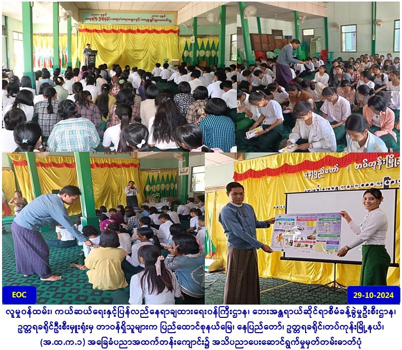 လူမှု၀န်ထမ်း၊ ကယ်ဆယ်ရေးနှင့်ပြန်လည်နေရာချထားရေး၀န်ကြီးဌာန၊ ဘေးအန္တရာယ်ဆိုင်ရာစီမံခန့်ခွဲမှုဦးစီးဌာန၊ ဥတ္တရခရိုင်ဦးစီးမှူးရုံးမှ တာဝန်ရှိသူများသည် ဌာနဆိုင်ရာများနှင့်ပူးပေါင်း၍ (၂၉-၁၀-၂၀၂၄) ရက်နေ့ (၁၃:၀၀) နာရီမှ (၁၅:၀၀) နာရီအချိန်ထိ ဥတ္တရခရိုင်၊ တပ်ကုန်းမြို့နယ်၊ (အ.ထ.က.၁) အခြေခံပညာအထက်တန်းကျောင်း၌ အရာထမ်း/အမှုထမ်းများ၊ ဆရာ/ဆရာမများနှင့် ကျောင်းသား/သူ စုစုပေါင်း (၂၀၀) ဦးခန့်အား သဘာဝဘေးနှင့်ပတ်သက်၍ ဆောင်ရန်/ရှောင်ရန်အချက်များ ဟောပြောခဲ့ပြီး လက်ကမ်းစာစောင်များဖြန့်ဝေပေးခြင်းနှင့် နံရံကပ်ပိုစတာပေးအပ်ခြင်းများ ဆောင်ရွက်ခဲ့ပါကြောင်း သတင်းရရှိပါသည်။