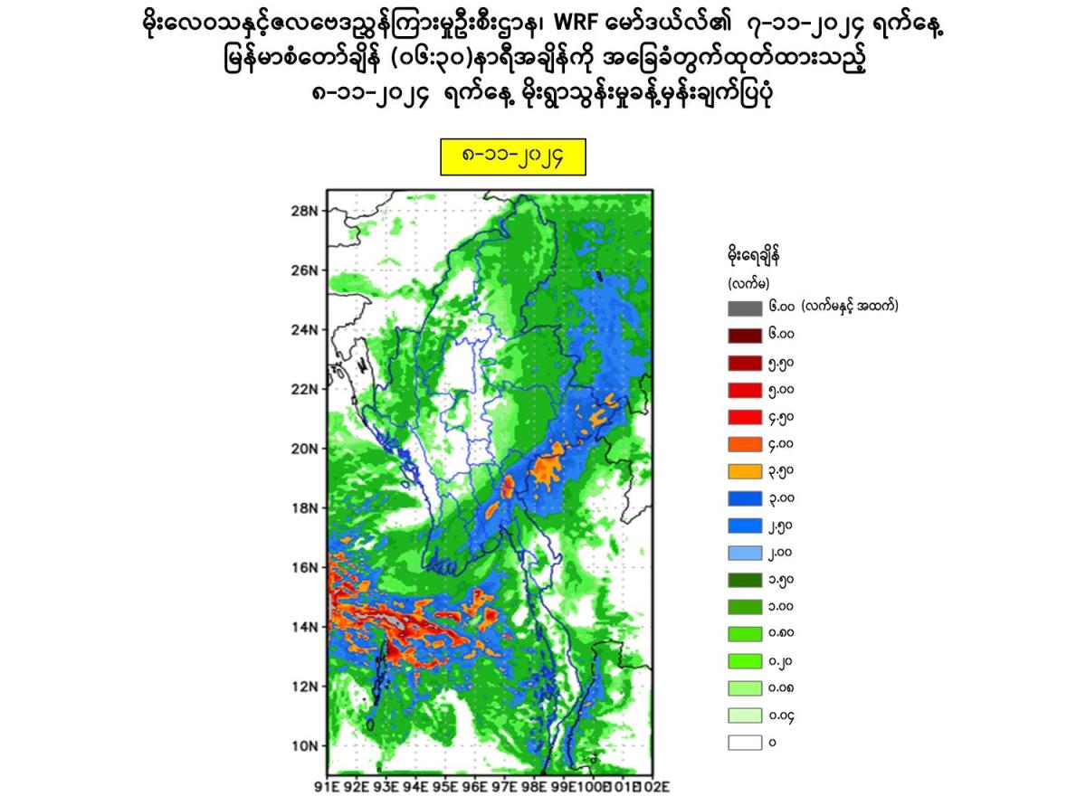 ၁။ ယနေ့မြန်မာစံတော်ချိန် (၁၄:၃၀) နာရီအချိန် တိုင်းထွာချက်များအရ တောင်တရုတ်ပင်လယ်ပြင်မှ ရွေ့လျားလာသော လေပွေလှိုင်းများကြောင့်လည်းကောင်း၊ ကပ္ပလီပင်လယ်ပြင်နှင့် ဘင်္ဂလားပင်လယ် အော်တို့မှ လေနွေးများနှင့် တရုတ်ပြည်မကြီးပေါ်ရှိ လေဖိအားကြီးရပ်ဝန်းဒေသမှ ရွေ့လျားလာသော လေအေးများ တွေ့ဆုံမှုကြောင့်လည်းကောင်း၊ ကပ္ပလီပင်လယ်ပြင်နှင့် ဘင်္ဂလားပင်လယ်အော်အရှေ့တောင်ပိုင်းတို့တွင် လေထုမငြိမ်မသက်မှုများ ဖြစ်ပေါ်လာနိုင်ခြင်းကြောင့်လည်းကောင်း ယနေ့မွန်းလွဲမှ (၈-၁၁-၂၀၂၄) ရက်နေ့အတွင်း နေပြည်တော်၊ စစ်ကိုင်းတိုင်းဒေသကြီးအောက်ပိုင်း၊ မန္တလေးတိုင်းဒေသကြီးနှင့် မကွေး တိုင်းဒေသကြီးတို့တွင် နေရာကျဲကျဲနှင့် စစ်ကိုင်းတိုင်းဒေသကြီးအထက်ပိုင်း၊ ပဲခူးတိုင်းဒေသကြီး၊ ရန်ကုန် တိုင်းဒေသကြီး၊ ဧရာဝတီတိုင်းဒေသကြီး၊ တနင်္သာရီတိုင်းဒေသကြီး၊ ကချင်ပြည်နယ်၊ ရှမ်းပြည်နယ်၊ ချင်းပြည်နယ်၊ ရခိုင်ပြည်နယ်၊ ကယားပြည်နယ်၊ ကရင်ပြည်နယ်နှင့် မွန်ပြည်နယ်တို့တွင် နေရာစိပ်စိပ်မှ နေရာအနှံ့အပြား မိုးထစ်ချုန်းရွာပြီး၊ အချို့ဒေသများတွင် ဒေသအလိုက် မိုးကြီးခြင်း၊ နေရာကွက်၍ မိုးကြီးခြင်းများ ဖြစ်ပေါ်နိုင်ပါသည်။