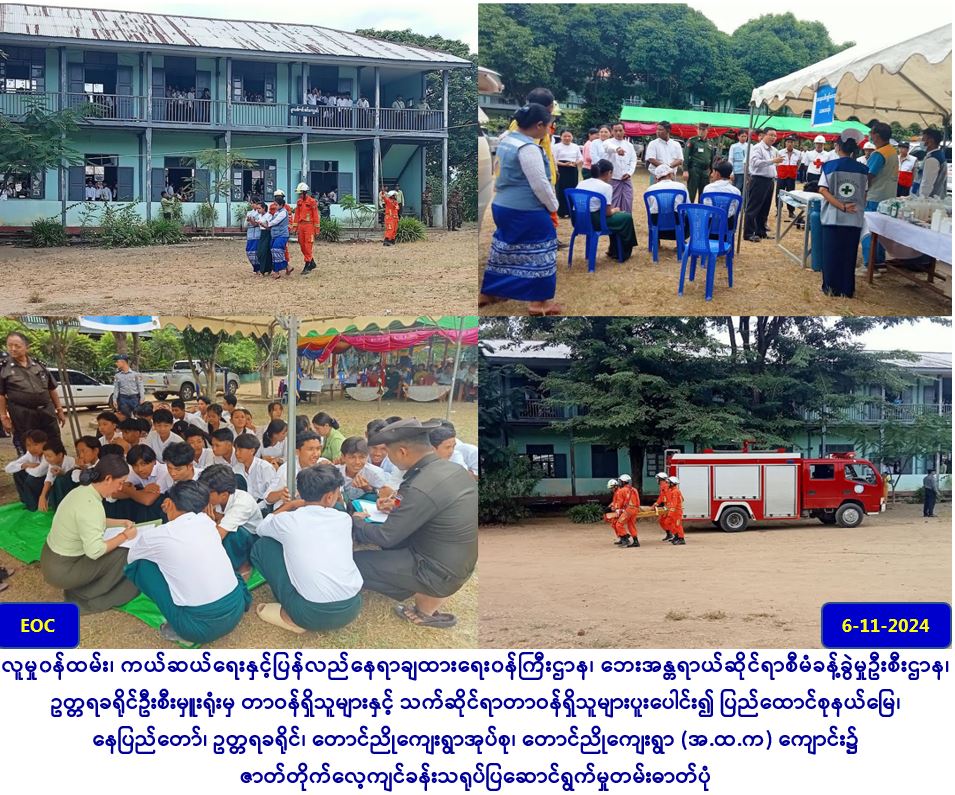 လူမှု၀န်ထမ်း၊ ကယ်ဆယ်ရေးနှင့်ပြန်လည်နေရာချထားရေး၀န်ကြီးဌာန၊ ဘေးအန္တရာယ်ဆိုင်ရာစီမံခန့်ခွဲမှုဦးစီးဌာန၊ ဥတ္တရခရိုင် ဦးစီးမှူးရုံးမှ တာဝန်ရှိသူများသည် (၆.၁၁.၂၀၂၄) ရက်နေ့၊ (၁၃:၀၀)နာရီအချိန်တွင် ပြည်ထောင်စုနယ်မြေ၊ နေပြည်တော်၊ ဥတ္တရ ခရိုင်အတွင်း သဘာဝဘေးအန္တရာယ်ကျရောက်ပါက ရှာဖွေကယ်ဆယ်ရေးလုပ်ငန်းများဆောင်ရွက်ရန် ဇာတ်တိုက်လေ့ကျင့်ခြင်း သရုပ်ပြအခမ်းအနားကို တောင်ညိုကျေးရွာအုပ်စု၊ တောင်ညိုကျေးရွာ (အ.ထ.က)၌ ကျင်းပပြုလုပ်ခဲ့ရာ နေပြည်တော်ကောင်စီဝင် ဦးဇေယျာလင်း၊ ဌာနဆိုင်ရာမှတာဝန်ရှိသူများ၊ ဆရာ/ဆရာမများ၊ ကျောင်းသား/သူများနှင့်အတူ ရှာဖွေ/ ကယ်ဆယ်/ ကုသရေးလုပ်ငန်းများတွင် ပူးပေါင်းပါဝင်ဆောင်ရွက်ခဲ့ပါကြောင်း သတင်းရရှိပါသည်။