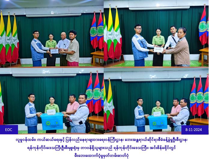လူမှု၀န်ထမ်း၊ ကယ်ဆယ်ရေးနှင့်ပြန်လည်နေရာချထားရေး၀န်ကြီးဌာန၊ ဘေးအန္တရာယ်ဆိုင်ရာစီမံခန့်ခွဲမှုဦးစီးဌာန၊ ရန်ကုန်တိုင်းဒေသကြီးဦးစီးမှူးရုံးမှ တာ၀န်ရှိသူများသည် (၂၅-၁၀-၂၀၂၄) ရက်နေ့ (၁၈:၅၀) နာရီအချိန်တွင် ရန်ကုန်တိုင်းဒေသကြီး၊ အင်းစိန်ခရိုင်၊ လှိုင်သာယာ(အရှေ့ပိုင်း)မြို့နယ်၊ ညောင်ကျေးရွာအုပ်စု၊ ဒိုင်စုကျေးရွာ၊ အမှတ် (၆၇)၊ ဂေါက်ကွင်းပတ်လမ်းတွင် မီးလောင်မှုကြောင့် လုံး၀ပျက်စီးအိမ်ခြေ (၁)လုံး ၊ အိမ်ထောင်စု (၁) စု၊ လူဦးရေ (၁၃) ဦးတို့အတွက် ဆန်ရိက္ခာဖိုးထောက်ပံ့ငွေ (၂၇,၃၀ဝိ/-)၊ လုံး၀ပျက်စီးအိမ်ခြေ (၁)လုံးအတွက် အိမ်ဆောက်ပစ္စည်းဖိုးထောက်ပံ့ငွေ (၁၀၀,၀၀ဝိ/-)၊ ကယ်ဆယ်ရေးပစ္စည်းတန်ဖိုး (၁၀၇,၆၇၈/-) အားလည်းကောင်း၊ (၁၀:၄၅) နာရီအချိန်၌ အမှတ် (၅) ရပ်ကွက်၊ သိင်္ဂီ (၁) လမ်းထောင့်တွင် မီးလောင်မှုကြောင့် တစ်စိတ်တစ်ပိုင်းပျက်စီးအိမ်ခြေ (၁)လုံးအတွက် အိမ်ဆောက်ပစ္စည်းဖိုးထောက်ပံ့ငွေ (၅၀,၀၀ဝိ/-)၊ အိမ်ထောင်စု (၁) စု၊ လူဦးရေ (၃) ဦးတို့အတွက် ဆန်ရိက္ခာဖိုးထောက်ပံ့ငွေ (၆,၃၀ဝိ/-)၊ စုစုပေါင်းထောက်ပံ့ငွေ (၅၆,၃၀ဝိ/-) တို့အားလည်းကောင်း၊ (၂၃-၁၀-၂၀၂၄) ရက်နေ့ (၀၇:၁၀) နာရီအချိန်၌ အမှတ် (၁) ရပ်ကွက်၊ ကနောင်လမ်းနှင့် တပင်ရွှေထီးလမ်း ထောင့်တွင် မီးလောင်မှုကြောင့် တစ်စိတ်တစ်ပိုင်းပျက်စီးနေအိမ် (၁) လုံးအတွက် အိမ်ဆောက်ပစ္စည်းဖိုးထောက်ပံ့ငွေ (၅၀,၀၀ဝိ/-)၊ အိမ်ထောင်စု (၁) စု၊ လူဦးရေ (၅) ဦးတို့အတွက် ဆန်ရိက္ခာဖိုးထောက်ပံ့ငွေ (၁၀,၅၀ဝိ/-) စုစုပေါင်းထောက်ပံ့ငွေ (၆၀,၅၀၀/-) တို့အား (၈-၁၁-၂၀၂၄) ရက်နေ့ (၁၆:၃၀) နာရီအချိန်၌ ဘေးသင့်ပြည်သူများလက်၀ယ်အရောက် ထောက်ပံ့ပေးအပ်ခဲ့ကြောင်း သတင်းရရှိပါသည်။
