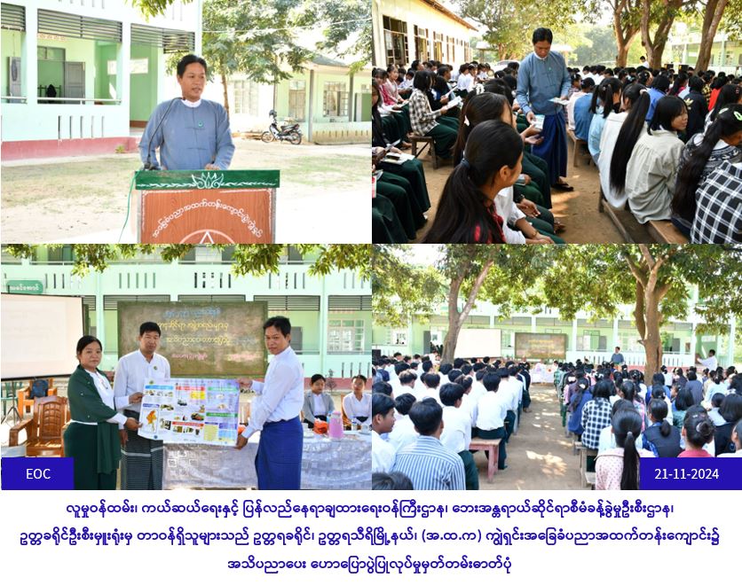 လူမှု၀န်ထမ်း၊ ကယ်ဆယ်ရေးနှင့်ပြန်လည်နေရာချထားရေး၀န်ကြီးဌာန၊ ဘေးအန္တရာယ်ဆိုင်ရာစီမံခန့်ခွဲမှု ဦးစီးဌာန၊ ဥတ္တခရိုင်ဦးစီးမှူးရုံးမှ တာဝန်ရှိသူများသည် (၂၁-၁၁-၂၀၂၄) ရက်နေ့ (၁၀:၀၀) နာရီမှ (၁၂:၀၀) နာရီအချိန်ထိ ဥတ္တရခရိုင်၊ ဥတ္တရသီရိမြို့နယ်၊ (အ.ထ.က) ကျွဲရှင်းအခြေခံပညာအထက်တန်းကျောင်း၌ ပြုလုပ်သည့် အသိပညာပေးဟောပြောပွဲသို့ ဌာနဆိုင်ရာများမှ အရာထမ်း/ အမှုထမ်းများ၊ ဆရာ/ ဆရာမများ၊ ကျောင်းသား/သူများ စုစုပေါင်း(၂၅၀) ဦးခန့်အား သဘာဝဘေးနှင့်ပတ်သက်၍ ဆောင်ရန်/ ရှောင်ရန်အချက်များအားအသိပညာပေးမျှဝေခဲ့ပြီး လက်ကမ်းစာစောင်များနှင့် နံရံကပ်ပိုစတာတို့အား ဝေငှခဲ့ကြောင်း သတင်းရရှိပါသည်။