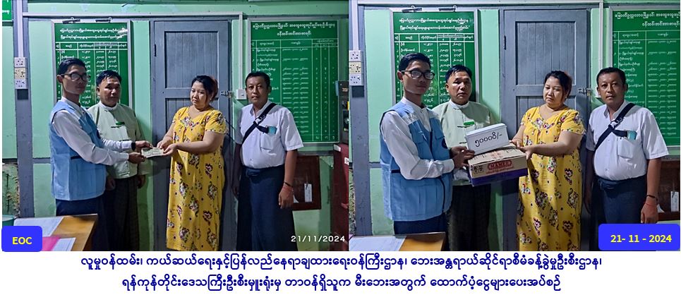 လူမှု၀န်ထမ်း၊ ကယ်ဆယ်ရေးနှင့်ပြန်လည်နေရာချထားရေး၀န်ကြီးဌာန၊ ဘေးအန္တရာယ်ဆိုင်ရာစီမံခန့်ခွဲမှုဦးစီးဌာန၊ ရန်ကုန်တိုင်း ဒေသကြီးဦးစီးမှူးရုံးမှ တာဝန်ရှိသူများသည် (၉-၁၁-၂၀၂၄)ရက်နေ့ (၁၇:၃၄)အချိန်၌ ရန်ကုန်တိုင်းဒေသကြီး၊ မြောက်ဥက္ကလာပ မြို့နယ်၊ (ဃ)ရပ်ကွက်၊ အမှတ် (၂၅၃)၊ ဝေပုလ္လ(၆) လမ်းတွင် မီးလောင်မှုကြောင့် နေအိမ်(၁)လုံး(တစ်စိတ်တစ်ပိုင်း)ပျက်စီးခဲ့ပြီး၊ ဘေးသင့်အိမ်ထောင်စု(၁)စု၊ ၊ လူဦးရေ ကျား(၁)ဦး၊ မ(၁)ဦး၊ စုစုပေါင်းလူဦးရေ (၂)ဦးအတွက် ဆန်ရိက္ခာဖိုးထောက်ပံ့ငွေကျပ် (၄,၂၀ဝိ/-)၊ အိမ်ခြေ(၁)လုံး (တစ်စိတ်တစ်ပိုင်း) ပျက်စီးအတွက် အိမ်ဆောက်ပစ္စည်းဖိုးထောက်ပံ့ငွေကျပ် (၅၀,၀၀ဝိ/-)၊ စုစုပေါင်း ထောက်ပံ့ငွေကျပ် (၅၄၂၀ဝိ/-)တို့အား (၂၁-၁၁-၂၀၂၄)ရက်နေ့၊ (၁၅:၄၆)နာရီအချိန်တွင် ပြည်သူများ၏လက်ဝယ်အရောက် ထောက်ပံ့ပေးအပ်ခဲ့ပါကြောင်း သတင်းရရှိပါသည်။