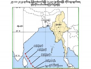 (၁) ယနေ့မြန်မာစံတော်ချိန် (၁၂:၃၀) နာရီအချိန် တိုင်းထွာချက်များအရ ဘင်္ဂလား ပင်လယ်အော်တောင်ပိုင်းတွင် ဖြစ်ပေါ်နေသော အားကောင်းသောလေဖိအားနည်း ရပ်ဝန်း (Well Marked Low Pressure Area)သည် အနောက်- အနောက်မြောက် ဘက်သို့ရွေ့လျားခဲ့ပြီး၊ ပိုမိုအားကောင်းလာကာ မုန်တိုင်းငယ် (Depression) အဖြစ်သို့ ရောက်ရှိခဲ့ပြီး၊ မြန်မာနိုင်ငံ၊ ကိုကိုးကျွန်းမြို့(Coco Island) ၏ အနောက် တောင်ဘက် ရေမိုင် ၇၂၅ မိုင်ခန့်၊ အိန္ဒိယနိုင်ငံ၊ ချင်းနိုင်မြို့(Chennai)၏ တောင်- အရှေ့တောင်ဘက် ရေမိုင် ၅၇၀ မိုင်ခန့်အကွာ ပင်လယ်ပြင်ကို ဗဟိုပြုနေပါသည်။ ဗဟိုချက်လေဖိအား ၁၀၀၄ ဟက်တိုပါစကယ်နှင့် အမြင့်ဆုံးလေတိုက်နှုန်းမှာ တစ်နာရီလျှင် မိုင် ၃၀ မှ ၃၅ မိုင်နှုန်းခန့် ဖြစ်ပါသည်။