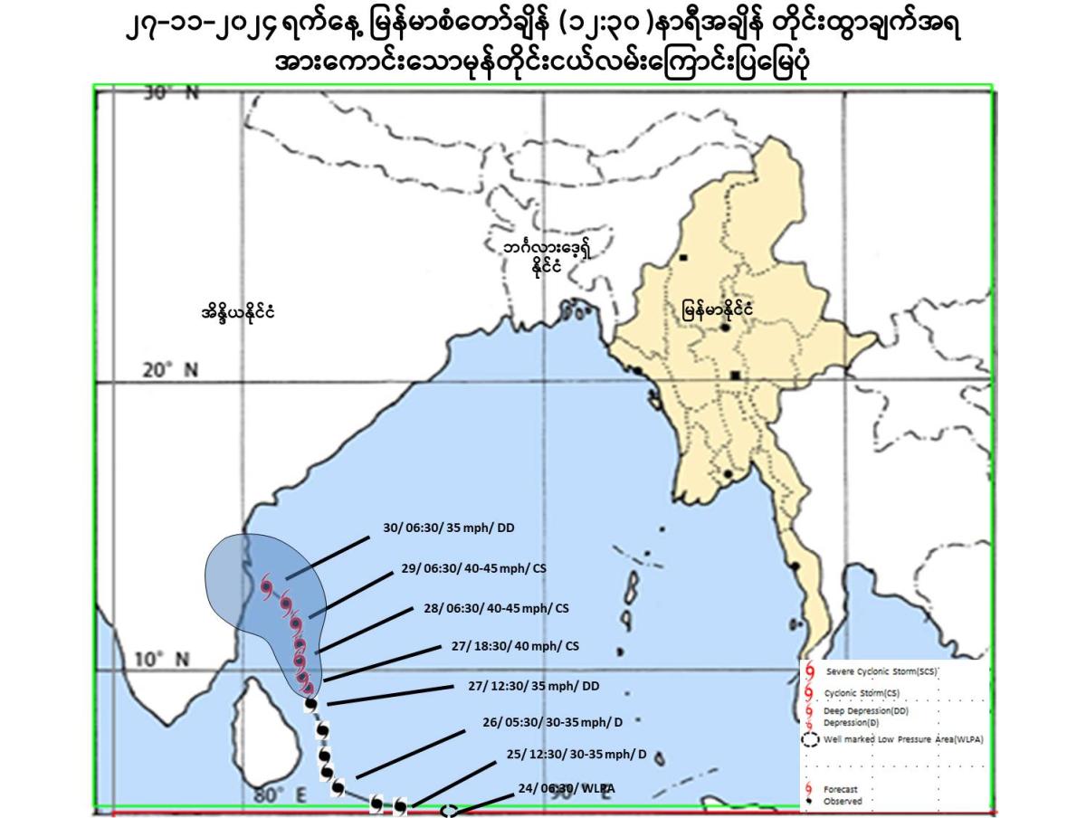 (၁) ယနေ့မြန်မာစံတော်ချိန် (၁၂:၃၀) နာရီအချိန် တိုင်းထွာချက်များအရ ဘင်္ဂလားပင်လယ် အော်အနောက်တောင်ပိုင်းတွင် ဖြစ်ပေါ်နေသော အားကောင်းသော မုန်တိုင်းငယ် (Deep Depression)သည် မြောက်-အနောက်မြောက်ဘက်သို့ ရွေ့လျားခဲ့ပြီး၊ မြန်မာနိုင်ငံ၊ ကိုကိုးကျွန်းမြို့(Coco Island)၏ အနောက်တောင်ဘက် ရေမိုင် ၇၄၀ မိုင်ခန့်၊ အိန္ဒိယနိုင်ငံ၊ ချင်းနိုင်မြို့(Chennai)၏ တောင်-အရှေ့တောင်ဘက် ရေမိုင် ၃၀၀ မိုင်ခန့် အကွာ ပင်လယ်ပြင်ကို ဗဟိုပြုနေပါသည်။ ဗဟိုချက်လေဖိအား ၁၀၀၁ ဟက်တိုပါ စကယ်နှင့် အမြင့်ဆုံးလေတိုက်နှုန်းမှာ တစ်နာရီလျှင် ၃၅ မိုင်နှုန်းခန့် ဖြစ်ပါသည်။