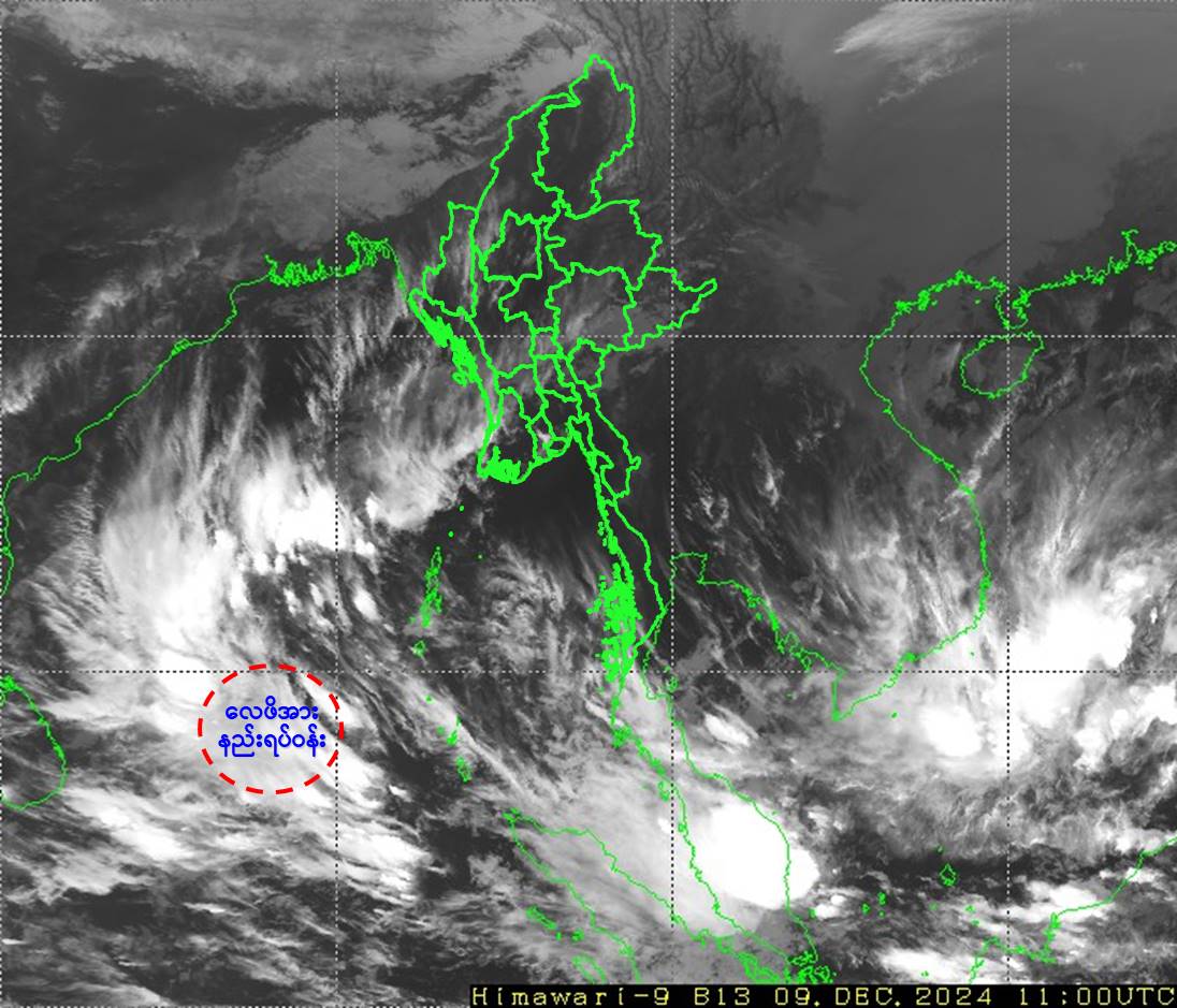 ၂၀၂၄ ခုနှစ်၊ ဒီဇင်ဘာလ (၉) ရက်နေ့ မြန်မာစံတော်ချိန် (၁၉:၀၀) နာရီအချိန်တွင် မိုးလေဝသနှင့် ဇလဗေဒညွှန်ကြားမှုဦးစီးဌာနမှ “လေဖိအားနည်းရပ်ဝန်းအခြေအနေ” ကို အောက်ပါအတိုင်း ထုတ်ပြန်ထားပါသည်-