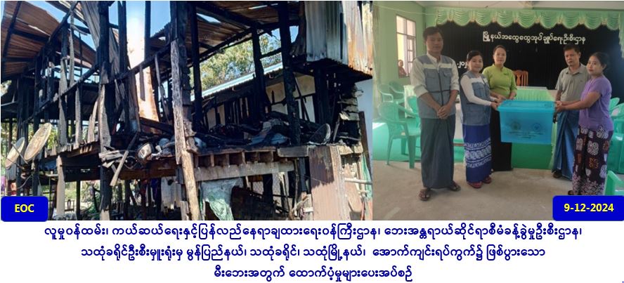 လူမှုဝန်ထမ်း၊ ကယ်ဆယ်ရေးနှင့် ပြန်လည်နေရာချထားရေးဝန်ကြီးဌာန၊ ဘေးအန္တရာယ်ဆိုင်ရာစီမံခန့်ခွဲမှုဦးစီးဌာန၊ သထုံခရိုင် ဦးစီးမှူးရုံးမှ တာဝန်ရှိသူများသည် (၇-၁၂-၂၀၂၄)ရက်နေ့ (၂၂းဝ၀) နာရီအချိန်၌ သထုံမြို့နယ်၊ အောက်ကျင်းရပ်ကွက်၌ မီးလောင်မှုကြောင့် လုံးဝပျက်စီးခဲ့သည့် လူနေအိမ် (၁)လုံးအတွက် အိမ်ဆောက်ပစ္စည်းဖိုးငွေ (၂၀၀၀၀၀/-)ကျပ်နှင့် လူဦးရေ (၅)ဦးတို့ အတွက် (၇)ရက်စာ ဆန်ရိက္ခာဖိုးငွေ (၁၀၅၀၀/-)ကျပ်၊ စုစုပေါင်းထောက်ပံ့ငွေ (၂၁၀၅၀၀/-)ကျပ်အားလည်းကောင်း၊ မီးဘေးသင့်ခဲ့သည့် အိမ်ထောင်စု (၁)စုအတွက် ကယ်ဆယ်ရေးပစ္စည်း (၁၆)မျိုး တန်ဖိုးငွေ (၁၀၇၆၇၈/-)ကျပ်အားလည်းကောင်း၊ (၉-၁၂-၂၀၂၄)ရက်နေ့ (၁၁:၀၀) နာရီအချိန်ခန့်တွင် သထုံမြို့နယ်အထွေထွေအုပ်ချုပ်ရေးဦးစီးဌာန၌ ဘေးသင့်ပြည်သူများထံ သွားရောက်ထောက်ပံ့ပေးခဲ့ပါကြောင်း သတင်းရရှိပါသည်။