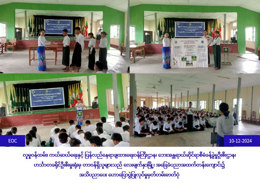 လူမှုဝန်ထမ်း၊ ကယ်ဆယ်ရေးနှင့်ပြန်လည်နေရာချထားရေးဝန်ကြီးဌာန၊ ဘေးအန္တရာယ်ဆိုင်ရာစီမံခန့်ခွဲမှု ဦးစီးဌာန၊ ဟင်္သာတခရိုင်ဦးစီးမှုးရုံးမှ တာဝန်ရှိသူများသည် (၁၀-၁၂-၂၀၂၄) ရက်နေ့တွင် လေးမျက်နှာမြို့၊ အခြေခံပညာအထက်တန်းကျောင်းတွင် ဆရာ/ ဆရာမ၊ ကျောင်းသား/ ကျောင်းသူ (၁၀၀) ဦးခန့်အား သဘာဝဘေးအသိပညာပေးဆွေးနွေးဟောပြောခြင်း၊ အသိပညာပေးဗွီနိုင်းပိုစတာဖြန့်ဝေခြင်းနှင့် လက်ကမ်း စာစောင်ဖြန့်ဝေခြင်းများ ဆောင်ရွက်ခဲ့ပါကြောင်း သတင်းရရှိပါသည်။