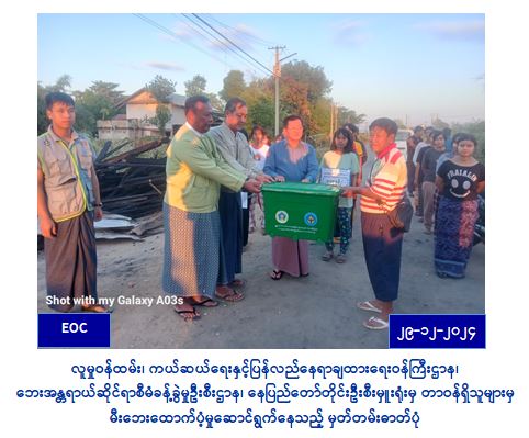 လူမှုဝန်ထမ်း၊ ကယ်ဆယ်ရေးနှင့်ပြန်လည်နေရာချထားရေးဝန်ကြီးဌာန၊ ဘေးအန္တရာယ်ဆိုင်ရာစီမံခန့်ခွဲမှုဦးစီးဌာန၊ နေပြည်တော် တိုင်းဦးစီးမှူးရုံးမှတာဝန်ရှိသူများသည် ပြည်ထောင်စုနယ်မြေ၊ နေပြည်တော်၊ ပျဉ်းမနားခရိုင်၊ ဇမ္ဗူသီရိမြို့နယ်၊ ရွှေကြာပင်ရပ်ကွက်၊ မေယုလမ်းနှင့် စိန်ပန်းပြာလမ်းထောင့်၌ (၂၈-၁၂-၂၀၂၄) ရက်နေ့(၂၃:၅၀)အချိန်တွင် ဖြစ်ပွားခဲ့သော မီးဘေးကြောင့်လုံးဝပျက်စီးခဲ့သော လူနေအိမ် (၁)လုံး အတွက် အိမ်ဆောက်ပစ္စည်းဖိုးထောက်ပံ့ငွေ(၂၀၀၀၀ဝ/-)၊ ဘေးသင့်လူဦးရေ(၁၅) ဦးအတွက် ဆန်ရိက္ခာဖိုးထောက်ပံ့ငွေ (၃၁၅၀ဝ/-)၊ စုစုပေါင်းထောက်ပံ့ငွေ (၂၃၁၅၀ဝ/-)နှင့် ကယ်ဆယ်ရေးပစ္စည်း(၁၆)မျိုးပါ ပုံး(၁)ပုံးတို့အား (၂၉-၁၂-၂၀၂၄) ရက် နေ့၊(၁၆:၀၀)နာရီတွင် ဘေးသင့်ပြည်သူများလက်ဝယ်သို့ သွားရောက်ထောက်ပံ့ခဲ့ကြောင်း သတင်းရရှိပါသည်။
