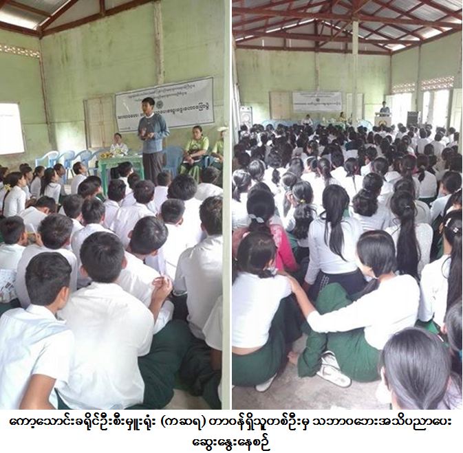 ကော့သောင်းခရိုင် ကယ်ဆယ်ရေးနှင့်ပြန်လည်နေရာချထားရေးဦးစီးဌာနမှ ဦးဆောင်ကာ ကော့သောင်းမြို့၊ အေးရိပ်ငြိမ်ရပ်ကွက် အထက်တန်း ကျောင်း၌ (၇-၁၂-၂၀၁၆) ရက်နေ့တွင် သဘာဝဘေးအသိပညာများဟောပြောပွဲပြုလုပ်ခဲ့ရာ ဆရာ၊ ဆရာမအပါအဝင် ကျောင်းသား၊ ကျောင်းသူ ပေါင်း (၃၀၀) ဦး တက်ရောက်ခဲ့ပြီး သဘာဝဘေးအန္တရာယ်နှင့်ပတ်သက်သော လက်ကမ်းစာစောင်များလည်း ဝေငှပေးခဲ့ပါကြောင်း သတင်းရရှိပါ သည်။
