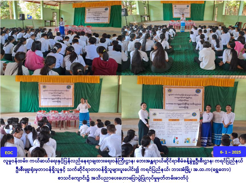 လူမှုဝန်ထမ်း၊ ကယ်ဆယ်ရေးနှင့် ပြန်လည်နေရာချထားရေးဝန်ကြီးဌာန၊ ဘေးအန္တရာယ်ဆိုင်ရာစီမံခန့်ခွဲမှုဦးစီးဌာန၊ ကရင် ပြည်နယ်ဦးစီးမှူးရုံးမှ တာဝန်ရှိသူများသည် လူမှုဝန်ထမ်းဦးစီးဌာန၊ ပြန်လည်ထူထောင်ရေးဦးစီးဌာနတို့နှင့်ပူးပေါင်း၍ (၆-၁-၂၀၂၅) ရက်နေ့၊ (၀၉:၃၀)အချိန်မှ (၁၁:၃၀) အချိန်ထိ ဘားအံမြို့၊ အ.ထ.က(ရွှေတော)စာသင်ကျောင်းတွင် အသိပညာပေးဟောပြောပွဲ ပြုလုပ်ခဲ့ရာ ကျောင်းဆရာ/မ (၁၁)ဦးနှင့် ကျောင်းသား/သူ (၁၁၀)ဦး၊ စုစုပေါင်း (၁၂၁)ဦးတို့ တက်ရောက်ခဲ့ကြပါသည်။ အဆိုပါ အသိပညာပေးဟောပြောပွဲတွင် ကရင်ပြည်နယ်ဦးစီးမှူးရုံးမှ သဘာဝဘေးအန္တရာယ်နှင့် ပတ်သက်၍ ဆောင်ရန်/ ရှောင်ရန် အချက်များ၊ သဘာဝပတ်ဝန်းကျင်ဆိုင်ရာကိစ္စရပ်များ၊ တောမီးအန္တရာယ်နှင့် ရာသီဥတုပြောင်းလဲမှုဆိုင်ရာကိစ္စရပ်များနှင့် ပတ်သက်၍လည်းကောင်း၊ လူမှုဝန်ထမ်းဦးစီးဌာနမှ အမျိုးသမီးများနှင့် အရေးပေါ်အခြေအနေများဆိုင်ရာကိစ္စရပ်များအား လည်းကောင်း၊ ပြန်လည်ထူထောင်ရေးဦးစီးဌာနမှ မသန်စွမ်းသူများ၏ အခွင့်အရေးများဆိုင်ရာကိစ္စရပ်များအားလည်းကောင်း ဟောပြောဆွေးနွေးခဲ့ပြီး ဘေး(၉)မျိုး အသိပညာပေးလက်ကမ်းစာစောင် (၄၅၀)စောင်အား ကျောင်းသား/သူများ ထံ ဝေငှပေးခြင်း၊ ကျောင်းစာကြည့်တိုက်အတွက် ရေဘေး (တိုင်းရင်းသားဘာသာစကား) လက်ကမ်းစာစောင် (၁၀၀) စောင်ပေးအပ်ခြင်း၊ ကျောင်းဝန်းအတွင်း ရေဘေးအသိပညာပေး (၄ x ၅) ပေ ဗီနိုင်းပိုစတာ ကပ်နှံနိုင်ရေးအတွက် ပေးအပ်ခြင်းများ ဆောင်ရွက်ခဲ့ပါ ကြောင်း သတင်းရရှိပါသည်။