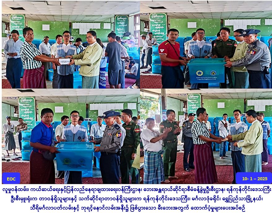 လူမှုဝန်ထမ်း၊ ကယ်ဆယ်ရေးနှင့် ပြန်လည်နေရာချထားရေးဝန်ကြီးဌာန၊ ဘေးအန္တရာယ်ဆိုင်ရာစီမံခန့်ခွဲမှုဦးစီးဌာန၊ ရန်ကုန်တိုင်း ဒေသကြီးဦးစီးမှူးရုံးမှ တာဝန်ရှိသူများသည် (၇-၁-၂၀၂၅)ရက်နေ့(၀၄:၅၁)နာရီအချိန်၌ ရန်ကုန်တိုင်းဒေသကြီး၊ မင်္ဂလာဒုံခရိုင်၊ ရွှေပြည်သာမြို့နယ်၊ သီရိမင်္ဂလာပတ်လမ်းနှင့် ဘုရင့်နောင်လမ်းအနီးတွင် မီးလောင်မှုကြောင့် နေအိမ် (၃)လုံး(လုံး၀ပျက်စီး) အတွက် အိမ်ဆောက်ပစ္စည်းဖိုးထာက်ပံ့ငွေကျပ် (၆၀၀,၀၀ဝိ/-)နေအိမ်(၁)လုံး (တစ်စိတ်တစ်ပိုင်းပျက်စီး)အတွက် အိမ်ဆောက် ပစ္စည်းဖိုးထောက်ပံ့ငွေကျပ်(၅၀၀၀ဝိ/-)၊ အိမ်ထောင်စု (၆၂)စု၊ လူဦးရေ (၁၅၄)ဦးတို့အတွက် ဆန်ရိက္ခာဖိုးထောက်ပံ့ငွေကျပ် (၃၂၃၄၀ဝိ/-)၊ ကယ်ဆယ်ရေးပစ္စည်းတန်ဖိုး (၆၆၇၆၀၃၆/-)တို့အား (၁၀-၁-၂၀၂၅)ရက်နေ့ (၁၄:၅၅)နာရီအချိန်တွင် ဘေးသင့် ပြည်သူများ လက်၀ယ်အရောက် သွားရောက်ထောက်ပံ့ပေးအပ်ခဲ့ပါကြောင်း သတင်းရရှိပါသည်။