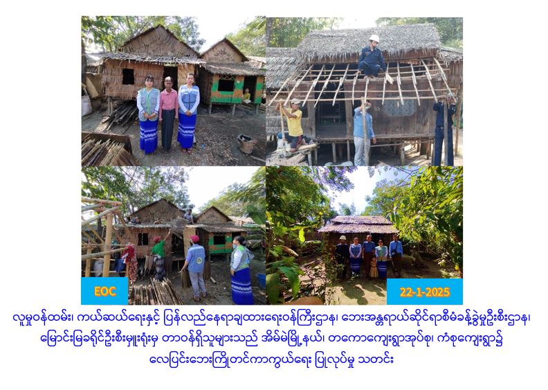 လူမှုဝန်ထမ်း၊ ကယ်ဆယ်ရေးနှင့် ပြန်လည်နေရာချထားရေးဝန်ကြီးဌာန၊ ဘေးအန္တရာယ်ဆိုင်ရာစီမံခန့်ခွဲမှုဦးစီးဌာန၊ မြောင်းမြခရိုင်ဦးစီးမှူးရုံးမှ တာဝန်ရှိသူများသည် (၂၂-၁-၂၀၂၅) ရက်နေ့တွင် အိမ်မဲမြို့နယ်၊ တကောကျေးရွာအုပ်စု၊ ကံစုကျေးရွာရှိ သက်ကြီးရွယ်အို၊ အမျိုးသမီးဦးဆောင်သည့်အိမ်၊ မသန်စွမ်း၊ လူဦးရေများပြီး ဆင်းရဲနွမ်းပါးသည့် မိသားစုနေအိမ်များအား ဦးစားပေးရွေးချယ်ပြီး လေပြင်းဘေးကြိုတင်ကာကွယ် ရေးအတွက် အားဖြည့်၊ မွမ်းမံပြင်ဆင်ခြင်းလုပ်ငန်းအား မြို့နယ်စီမံအုပ်ချုပ်ရေးအဖွဲ့များ၊ ကျေးရွာအုပ်ချုပ်ရေးမှူးများ၊ ရပ်မိရပ်ဖများ၊ မီးသတ်တပ်ဖွဲ့များ၊ ကြက်ခြေနီတပ်ဖွဲ့များ၊ သစ္စာရှင်ပရဟိတအဖွဲ့နှင့် ပြည်သူ လူထုများ ပူးပေါင်း၍ ဆောင်ရွက်ခဲ့ကြောင်း သတင်းရရှိပါသည်။