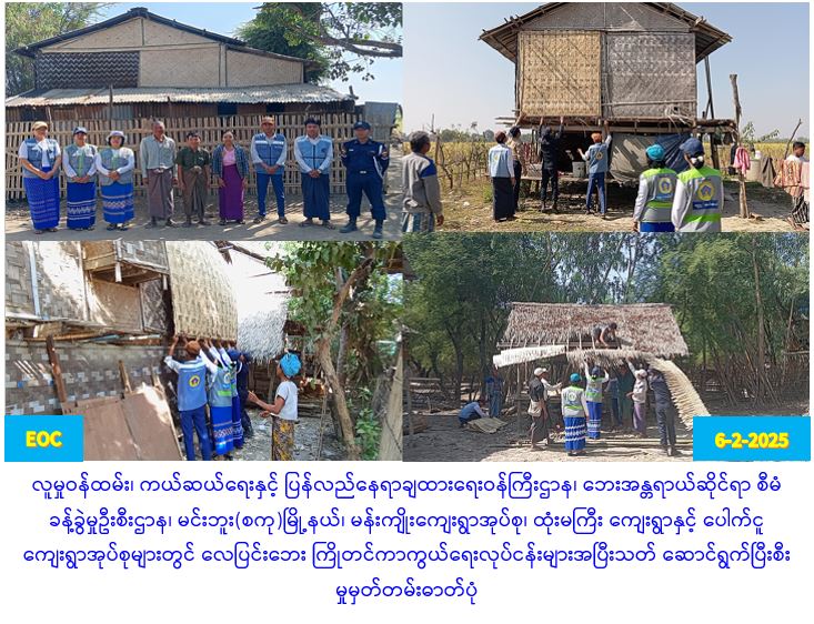 လူမှုဝန်ထမ်း၊ ကယ်ဆယ်ရေးနှင့် ပြန်လည်နေရာချထားရေးဝန်ကြီးဌာန၊ ဘေးအန္တရာယ်ဆိုင်ရာစီမံခန့်ခွဲမှု ဦးစီးဌာန၊ မင်းဘူးခရိုင်ဦးစီးမှူးရုံးမှ တာဝန်ရှိသူများသည် မိုးဦးကာလများဖြစ်သော ဧပြီလနှင့် မေလများ၌ နှစ်စဥ် ဖြစ်ပွားလျက်ရှိသည့် လေပြင်းဘေးအန္တရာယ်များနှင့်ပတ်သက်၍ လေပြင်းဒဏ်ခံ နိုင်သော ရပ်ရွာအသိုက်အဝန်းတစ်ခုဖြစ်စေရန်နှင့် လေပြင်းဘေးကြိုတင်ကာကွယ်နိုင်ရန်အတွက် အိုးအိမ်ဖြည့်တင်း ပြင်ဆင်ခြင်းလုပ်ငန်းများကို မင်းဘူး(စကု)မြို့နယ်၊ မန်းကျိုးကျေးရွာအုပ်စု၊ ထုံးမကြီး ကျေးရွာနှင့် ပေါက်ငူကျေးရွာအုပ်စု၊ ပေါက်လေးပင်ကျေးရွာတို့တွင် (၂၈-၁-၂၀၂၅)ရက်နေ့မှ (၃၁-၁-၂၀၂၅)ရက်နေ့အထိ ကြက်ခြေနီတပ်ဖွဲ့ဝင်များ၊ မီးသတ်တပ်ဖွဲ့၀င်များ၊ ကျေးရွာအုပ်ချုပ်ရေးအဖွဲ့ဝင်များ၊ ရပ်မိ ရပ်ဖများနှင့်အတူ ပူးပေါင်း၍ အပြီးသတ်ဆောင်ရွက်ခဲ့ပါကြောင်း သတင်းရရှိပါသည်။