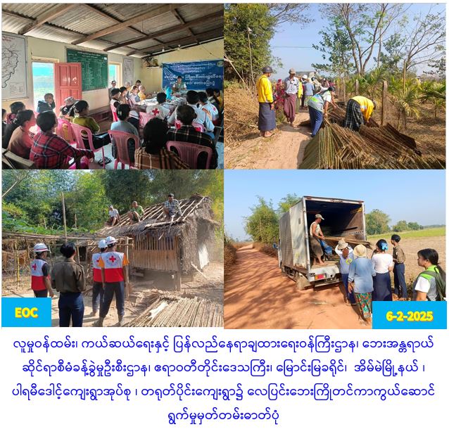 လူမှုဝန်ထမ်း၊ ကယ်ဆယ်ရေးနှင့် ပြန်လည်နေရာချထားရေးဝန်ကြီးဌာန၊ ဘေးအန္တရာယ်ဆိုင်ရာစီမံခန့်ခွဲမှု ဦးစီးဌာန၊ မြောင်းမြခရိုင်ဦးစီးမှူးရုံးမှ တာဝန်ရှိသူများသည် (၆-၂-၂၀၂၅)ရက်နေ့တွင် အိမ်မဲမြို့နယ်၊ ပါရမီဒေါင့်ကျေးရွာအုပ်စု၊ တရုတ်ပိုင်းကျေးရွာရှိ သက်ကြီးရွယ်အို၊ အမျိုးသမီးဦးဆောင်သည့်အိမ်၊ မသန်စွမ်း၊ လူဦးရေများပြီး ဆင်းရဲနွမ်းပါးသည့် မိသားစုနေအိမ်များအား ဦးစားပေးရွေးချယ်ပြီး လေပြင်း ဘေးကြိုတင်ကာကွယ်ရေးအတွက် အားဖြည့်၊ မွမ်းမံပြင်ဆင်ခြင်းလုပ်ငန်းနှင့် အသိပညာပေးဟောပြော ခြင်းများအား မြို့နယ်စီမံအုပ်ချုပ်ရေးအဖွဲ့များ၊ကျေးရွာအုပ်ချုပ်ရေးမှူးများ၊ ရပ်မိရပ်ဖများ၊ မီးသတ် တပ်ဖွဲ့များ ၊ကြက်ခြေနီတပ်ဖွဲ့များ၊ သစ္စာရှင်ပရဟိတအဖွဲ့နှင့် ပြည်သူလူထုများ ပူးပေါင်း၍ အသိပညာ ပေးလုပ်ငန်းများဆောင်ရွက်ခဲ့ကြောင်းသတင်းရရှိပါသည်။