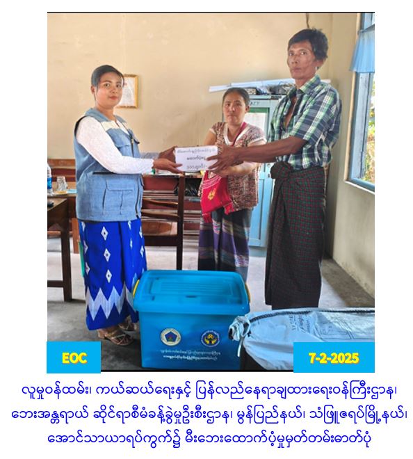 လူမှုဝန်ထမ်း၊ ကယ်ဆယ်ရေးနှင့် ပြန်လည်နေရာချထားရေးဝန်ကြီးဌာန၊ ဘေးအန္တရာယ်ဆိုင်ရာစီမံခန့်ခွဲမှု ဦးစီးဌာန၊ သံဖြူဇရပ်မြို့နယ်ဦးစီးမှူးရုံးမှ တာဝန်ရှိသူများသည် သံဖြူဇရပ်မြို့နယ်၊ အောင်သာယာရပ် ကွက်၊ အိမ်အမှတ်(၂၉)၊ ဘုရင့်နောင်လမ်းတွင် (၅-၂-၂၀၂၅ ) ရက်နေ့(၁၄:၂၅) အချိန်၌ မီးကြွင်းမီးကျန်မှ တဆင့်မီးလောင်ကျွမ်းမှုဖြစ်ပွားခဲ့သည့် အိမ်ထောင်စု(၁) စု အတွက် အိမ်ဆောက်ပစ္စည်းဖိုး ထောက်ပံ့ ငွေကျပ် (၁၀၀၀၀ဝိ/-) ၊ လူဦးရေ(၅)ဦးအတွက် ဆန်ရိက္ခာဖိုးထောက်ပံ့ငွေကျပ် (၁၀၅၀ဝိ/-)၊ ကယ်ဆယ် ရေးပစ္စည်း(၁၆)မျိုးတန်ဖိုးငွေ(၁၂၃၁၇၈)ကျပ်၊ စုစုပေါင်းထောက်ပံ့ငွေ (၂၂၃၆၇၈)ကျပ် တိတိအား (၇-၂-၂၀၂၅)ရက်နေ့၊ (၁၀:၀၀) နာရီအချိန်တွင် အောင်သာယာရပ်ကွက် အုပ်ချုပ်ရေးမှူးရုံး၌ ဘေးသင့်ပြည်သူ များ လက်ဝယ်အရောက် ထောက်ပံ့ပေးအပ်ခဲ့ကြောင်းသတင်းရရှိပါသည်။