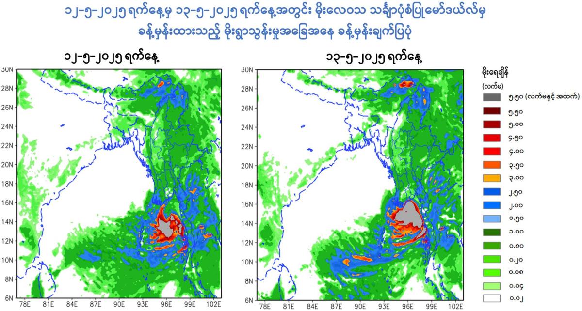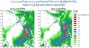 သို့ဖြစ်ပါ၍ မိုးသည်းထန်စွာရွာသွန်းခြင်းနှင့်အတူ လေပြင်းတိုက်ခတ်ခြင်း၊ မိုးထစ်ချုန်းခြင်း၊ မိုးကြိုးပစ်ခြင်း၊ လျှပ်စီးလက်ခြင်း၊ မိုးသီးကြွေခြင်း၊ လျှပ်တစ်ပြက်ရေကြီးခြင်းနှင့် မြေပြိုခြင်းစသည့် သဘာဝဘေးအန္တရာယ်များဖြစ်ပေါ်နိုင်ပါသဖြင့် အဆိုပါဒေသများရှိ ကုန်းမြင့်ဒေသအနီးတွင် နေထိုင် ကြသူများအနေဖြင့် မြေပြိုမှုအန္တရာယ်၊ မြစ်ငယ်၊ ချောင်းငယ်များအနီးတွင် နေထိုင်ကြသူများအနေ ဖြင့် ရေကြီး၊ ရေလျှံမှုများကို ကြိုတင်သတိပြုရှောင်ရှားနိုင်ပါရန်နှင့် ပြည်တွင်းရေကြောင်း သွားလာ ရေးနှင့် လေကြောင်းပျံသန်းရေးအနေဖြင့်လည်း ကြိုတင်သတိပြုနိုင်ပါရန် သတိပေးနှိုးဆော်အပ် ပါသည်။