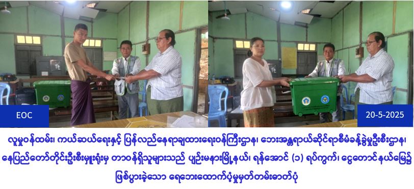 လူမှုဝန်ထမ်း၊ ကယ်ဆယ်ရေးနှင့် ပြန်လည်နေရာချထားရေးဝန်ကြီးဌာန၊ ဘေးအန္တရာယ်ဆိုင်ရာစီမံခန့်ခွဲမှုဦးစီးဌာန၊ နေပြည်တော်တိုင်းဦးစီးမှူးရုံးမှတာဝန်ရှိသူများသည် ပျဉ်းမနားမြို့နယ်၊ ရန်အောင် (၁) ရပ်ကွက်၊ ငွေတောင်နယ်မြေ၌ (၁၆-၅-၂၀၂၅) ရက်နေ့တွင်ဖြစ်ပွားခဲ့သော ရေဘေးကြောင့် လုံးဝပျက်စီးခဲ့သော လူနေအိမ် (၁) လုံးအတွက် အိမ်ဆောက်ပစ္စည်းဖိုးထောက်ပံ့ငွေ (၁၀၀,၀၀၀ိ/-)၊ တစ်စိတ်တစ်ပိုင်းနေအိမ် (၁) လုံးအတွက် အိမ်ဆောက်ပစ္စည်းဖိုးထောက်ပံ့ငွေ (၅၀,၀၀၀ိ/-)၊ ဘေးသင့်လူဦးရေ (၁၂) ဦးအတွက် ဆန်ရိက္ခာဖိုးထောက်ပံ့ငွေ (၆၀,၀၀၀ိ/-)၊ စုစုပေါင်းထောက်ပံ့ငွေ (၂၁၀,၀၀ဝိ/-)နှင့် (၁၀၇,၆၇၈/-) တန်ဖိုးရှိကယ်ဆယ်ရေးပစ္စည်း (၁၆) မျိုးပါ (၁) အိမ်ထောင်စု စာတို့အား ပျဉ်းမနားမြို့နယ်၊ ရန်အောင်(၁) အုပ်ချုပ်ရေးမှူးရုံး၌ (၂၀-၅-၂၀၂၅) ရက်နေ့၊ (၁၁:၃၀) အချိန်တွင် ဘေးသင့်ပြည်သူများလက်ဝယ်သို့ သွားရောက်ထောက်ပံ့ခဲ့ပါကြောင်း သတင်းရရှိပါသည်။