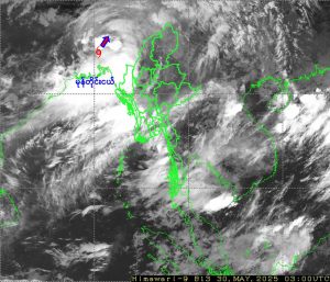 ၂၀၂၅ ခုနှစ်၊ မေလ (၃၀) ရက်နေ့ မြန်မာစံတော်ချိန် (၁၁:၀၀) နာရီအချိန်တွင် မိုးလေဝသနှင့် ဇလဗေဒညွှန်ကြားမှုဦးစီးဌာနမှ “မုန်တိုင်းငယ်သတင်း အမှတ်စဉ်(၀၆/၂၀၂၅)” ကို အောက်ပါအတိုင်း ထုတ်ပြန်ထားပါသည်-