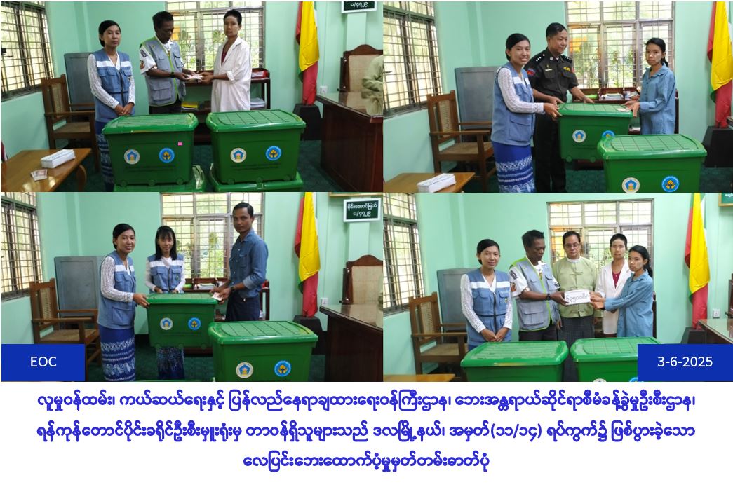 လူမှုဝန်ထမ်း၊ ကယ်ဆယ်ရေးနှင့် ပြန်လည်နေရာချထားရေးဝန်ကြီးဌာန၊ ဘေးအန္တရာယ်ဆိုင်ရာစီမံခန့်ခွဲမှု ဦးစီးဌာန၊ ရန်ကုန်တောင်ပိုင်းခရိုင်ဦးစီးမှူးရုံး (သန်လျင်) မှ တာဝန်ရှိသူများသည် ၂၈-၅-၂၀၂၅ ရက်နေ့၊ (၁၉:၄၅) နာရီအချိန်၌ တွံ့တေးခရိုင်၊ ဒလမြို့နယ်၊ အမှတ်(၁၁/၁၄) ရပ်ကွက်၊ ခိုင်စံပယ်လမ်းနှင့် ကန်ဘောင်လမ်းတွင် မိုးသည်းထန်စွာရွာသွန်းပြီး လေပြင်းတိုက်ခတ်မှုကြောင့် လုံးဝပျက်စီးအိမ်ခြေ (၄)လုံး၊ အိမ်ထောင်စု (၄) စု၊ ဘေးသင့်လူဦးရေ (၂၇) ဦးတို့အတွက် ဆန်ရိက္ခာဖိုးထောက်ပံ့ငွေ (၁၃၅,၀၀ဝိ/-) နှင့် လုံးဝပျက်စီးအိမ်ခြေ (၄) လုံးအတွက် အိမ်ဆောက်ပစ္စည်းဖိုးထောက်ပံ့ငွေ (၅၀၀,၀၀ဝိ/-)၊ စုစုပေါင်း ထောက်ပံ့ငွေ (၆၃၅,၀၀ဝိ/-)နှင့် အိမ်ထောင်စု (၄) စုအတွက် (၄၃၂,၀၂၄/-) တန်ဖိုးရှိ ကယ်ဆယ်ရေးပစ္စည်း (၁၇) မျိုး၊ အိမ်ထောင်စု (၄) စုစာတို့အား (၃-၆-၂၀၂၅) ရက်နေ့၊ (၁၀:၀၀) နာရီအချိန်တွင် ဒလမြို့နယ် စီမံအုပ်ချုပ်ရေးအဖွဲ့၊ ဥက္ကဋ္ဌနှင့်အဖွဲ့ဝင်များ၊ ရပ်ကွက်အုပ်ချုပ်ရေးမှူးတို့နှင့်အတူ ဘေးသင့်ပြည်သူများ လက်ဝယ်အရောက် ထောက်ပံ့ပေးအပ်ခဲ့ကြောင်း သတင်းရရှိပါသည်။
